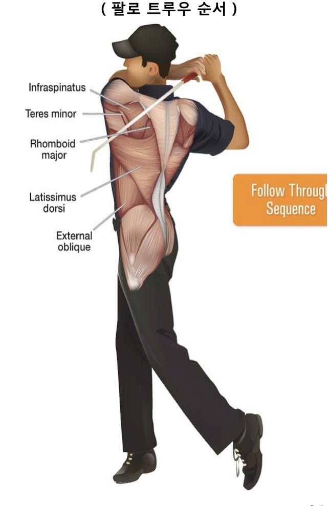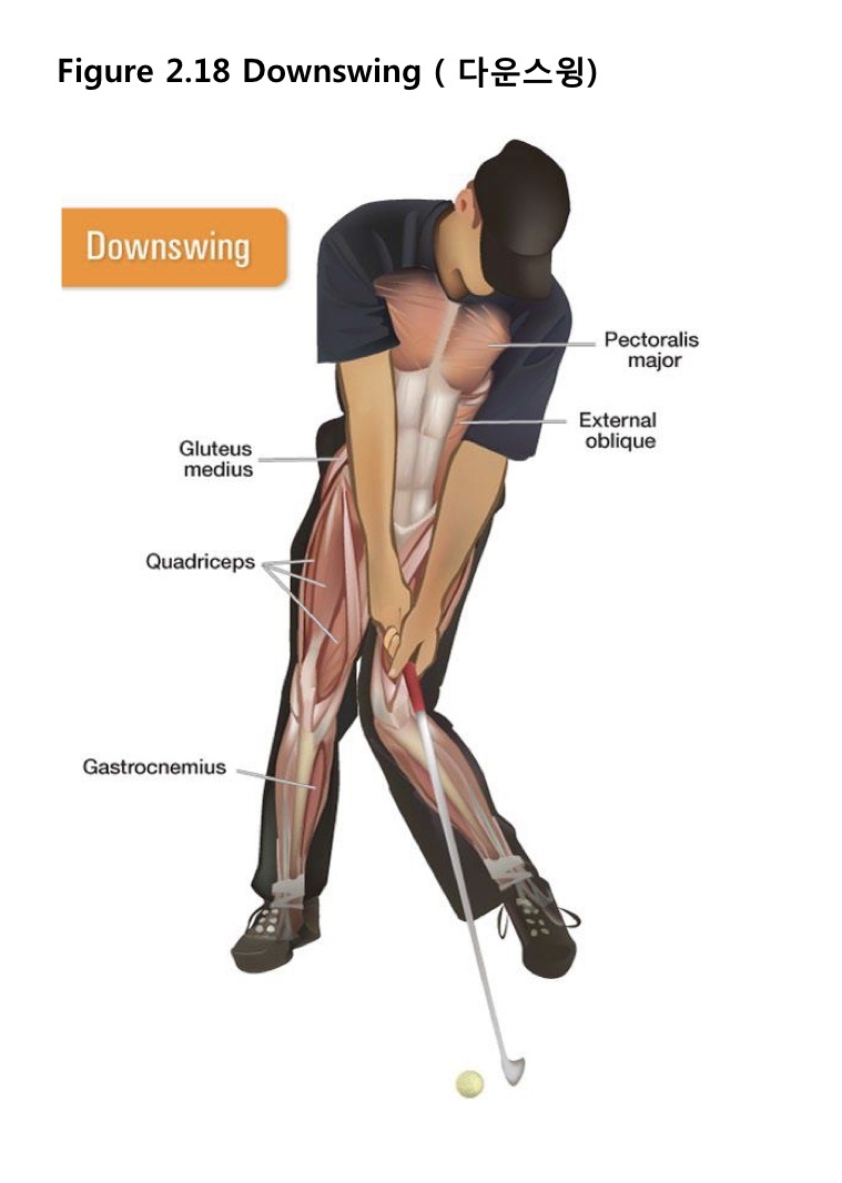 특히, 다운스윙을 하는 동안 광배근과 견갑하근 그리고 대흉근이 활동적으로 개입을 합니다. 자세 유지에 있어서 척추기립근과 외복사근의 후면섬유가 큰 기여를 합니다.
