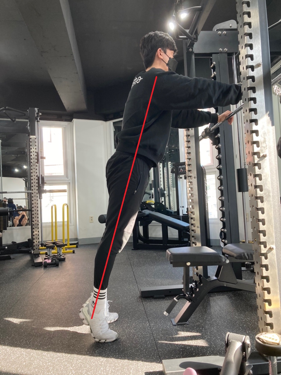 1. 골반과 척추의 중립자세를 유지한상태로 앞에 위치한 지지대를 잡고