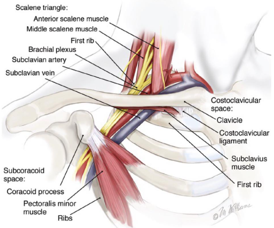 목 주변에서 큰 근육으로는 승모근과 흉쇄유돌근의 상호작용이 중요하며 그 밖에 날개뼈 주변근육으로는 견갑거근, 능형근과 전거근의 상호작용 또한 중요합니다. 추가적으로 소흉근과 대흉근의 몸통을 앞으로 말게만드는 단축성긴장의 힘은 역학적으로 목의 위치를 앞으로 거북목처럼 끌어당기기 때문에 신장성수축을 위한 동작의 운동들이 필요합니다. 뿐만 아니라 움크려진 몸통뼈대는 호흡에 있어서 단축된 긴장성 호흡을 일으키게하여 보조근으로 쓰이는 목에 더 강한 부담을 주기도 합니다.