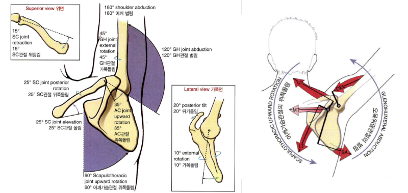 만약 친구나 가족이 내가 가기 싫은 곳을 억지로 가자고 하자면 기분이 어떠한가? 게다가 억지로 끌려간다면 또 그 기분이 어떠할지 생각해보자. 우리의 어깨도 움직임으로부터 싫어하는 움직임이 있다. 나의 체형을 바르게 이해하지 못하고 운동을 한다면 그야말로 어깨가 싫어하는 움직임을 억지로 하게 되는데 그것도 저항을 들어서 말이다. 이렇게 지속되면 관절의 움직임에 이상이 생기게 되어 팔을 어떤 각도 이상으로 움직이기만 하면 통증이 발생하는 사태가 발생하기도 한다. 왜 그런 것일까? 대다수의 사례를 예를 들자면 나의 몸을 제대로 알지 못하고 병원에 간다면 힘줄에 염증이 발생했다는 진단을 받게 될 것인데 과연 잘못된 방향으로 움직여서 생긴 문제가 약을 먹고 좋아질 것인가에 대해서는 한번 더 생각을 해보아야 한다. 근육이완제와 소염진통제의 처방으로 어느 정도 통증을 잊어 움직임에 회복이 될 수 있으나 다치기 전과 같은 움직임을 하게 된다면 그야말로 시한폭탄을 어깨에 지고 운동하는 것과 무엇이 다를지 생각을 해보아야 한다. 그러면 어깨가 싫어하는 움직임은 어떤 것인지 알아보자. 어깨가 싫어하는 움직임을 알기 전에 팔뼈라고 불리는 상완골과 날개뼈로 알려져 있는 견갑골 그리고 쇄골뼈의 리듬 있는 움직임에 대하여 알고 있어야 한다. 앞을 바라보고 있는 차렷 자세에서 한 팔을 귀까지 옆으로 쭉 들어 올리는 외전(Abduction) 동작을 진행할 때 팔의 각도적인 위치에 따라 견갑골과 쇄골의 움직임이 반응을 한다는 것이다. 아래 사진을 보면 상완골(팔뼈)이 60도 외전 동작부터 견갑골과 상완골의 1 : 2 비율로 움직인다는 것을 볼 수 있다. 견갑골이 움직임에 따라 쇄골뼈도 아래 사진과 같이 움직인다. 만약 굽은 어깨(Round shoulder) 체형으로 상완골(팔뼈)이 내회전(Internal rotation) 근육이 단축성 긴장으로 굳어져 있는 상태에서 팔을 외전(Abduction)한다면 어떻게 될까?