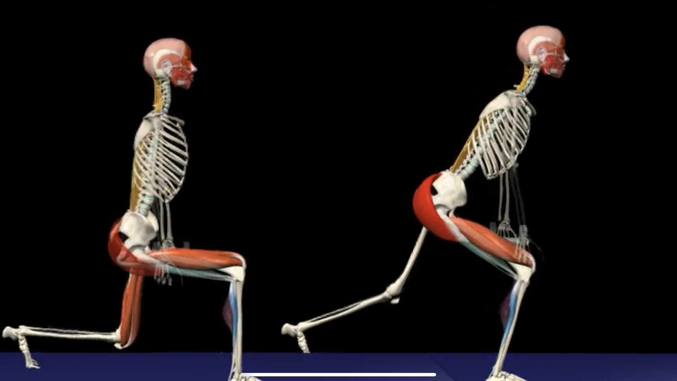 위 사진에서 보다시피 앞다리에 체중을 집중적으로 실어주냐, 뒤에있는 다리에 체중을 좀더 실어주냐에 따라 상체의 기울기가 달라지는 것을 볼 수 있습니다. 무게중심의 변화에 따라 자극도 달라지게 되는데 상체가 세워지면 앞허벅지의 자극이 크게 올라가며, 뒤에있는 다리에도 앞허벅지의 힘이 강하게 들어가는 느낌을 받을 수 있습니다. 상체를 앞쪽으로 기울여 앞다리의 뒷꿈치에 체중을 더 실어주게 되면 앞에 놓은다리의 둔부와 뒤허벅지 그리고 앞허벅지가 고르게 자극을 받으며 뒤에 놓은 다리엔 저항이 거의 걸리지 않게 됩니다.