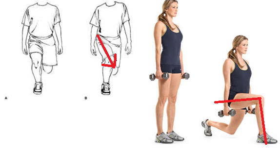 사람이 큰 보폭으로 걷는 동작과 비슷한 움직임으로 진행되는 런지입니다. 런지에서도 워킹런지(Walking lunge), 프론트 런지(Front lunge), 빽 런지(Back lunge), 사이드 런지(Side lunge), 크로스 런지(Cross lunge), 점프런지(Jump lunge), 스플릿스쿼트(Split squat) 등 여러가지 동작들로 응용이 가능합니다. 이 중에서도 공통적으로 나오는 움직임 중에 앞에 놓이는 다리에 있어서 무릎방향과 발끝 방향의 일치, 그리고 무릎이 발목보다 덜 나가는 동작으로 인한 무릎 주변 인대 조직들의 손상을 유발할 수 있는 동작들을 조심하셔야 합니다. 특히 오른쪽 사진에서 보시다시피 무릎은 어느정도 앞으로 움직이는 병진운동과 회전운동을 같이 동반한 움직임이 나와야 더 큰 힘을 근육으로 받아 사용할 수 있습니다.