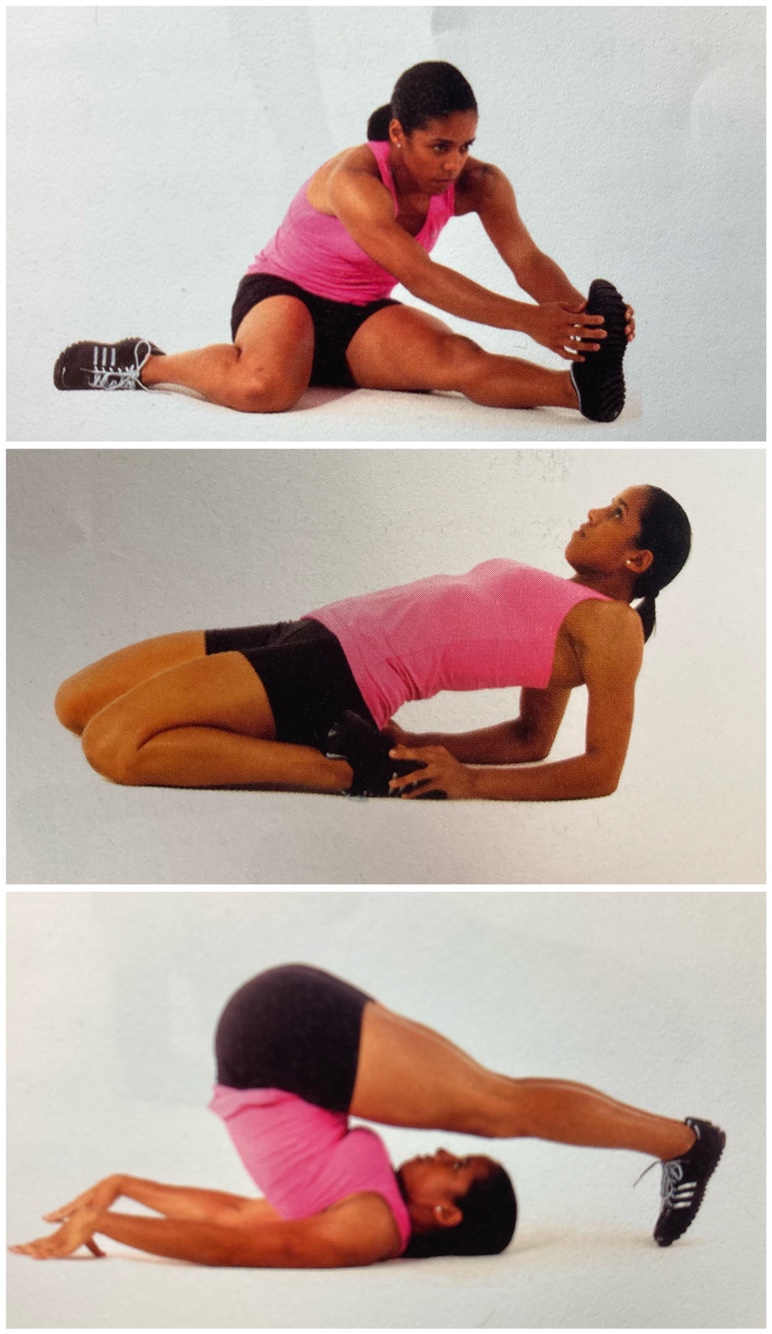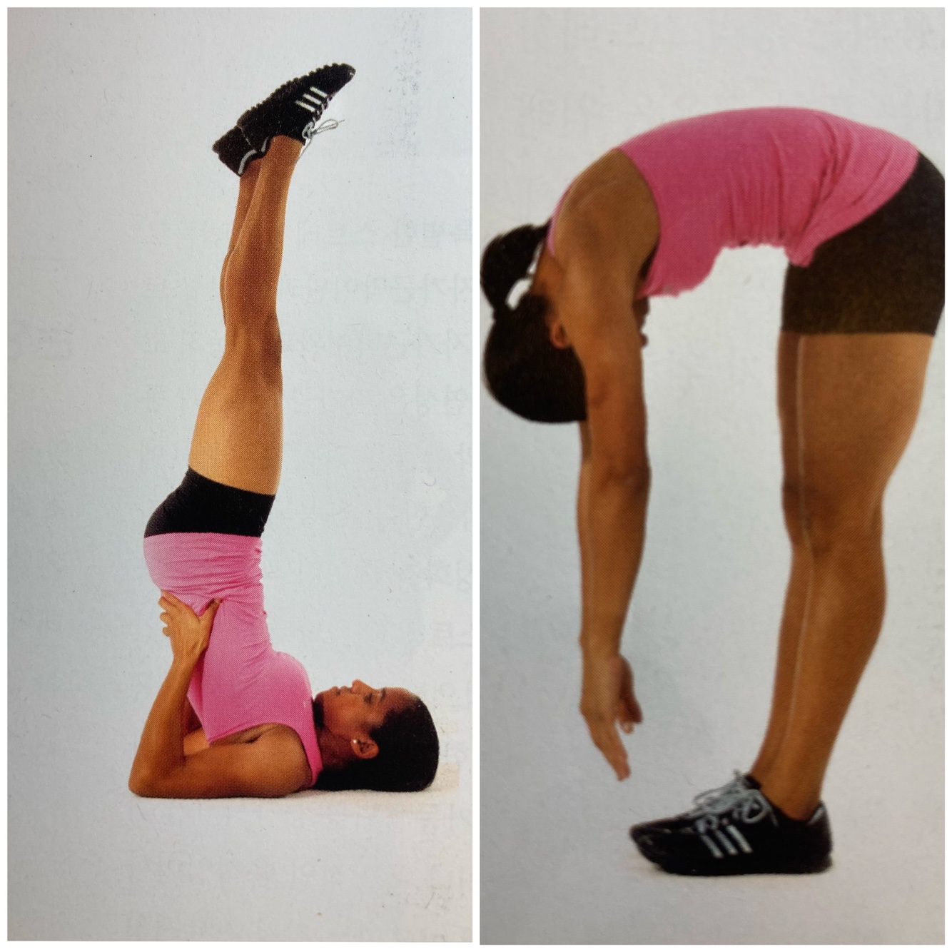 왼쪽 사진 1. 어깨로 서기(Shoulder stand) 동작이다. 주로 요가에서 행하는 동작이다. 이 동작은 목, 어깨 척추에 높은 부하를 줄 수 있다. 고혈압이나 목, 척추 손상의 병력을 가진 환자들 또는 정확한 방법을 이용하지 않는다면 피하는 게 좋다.