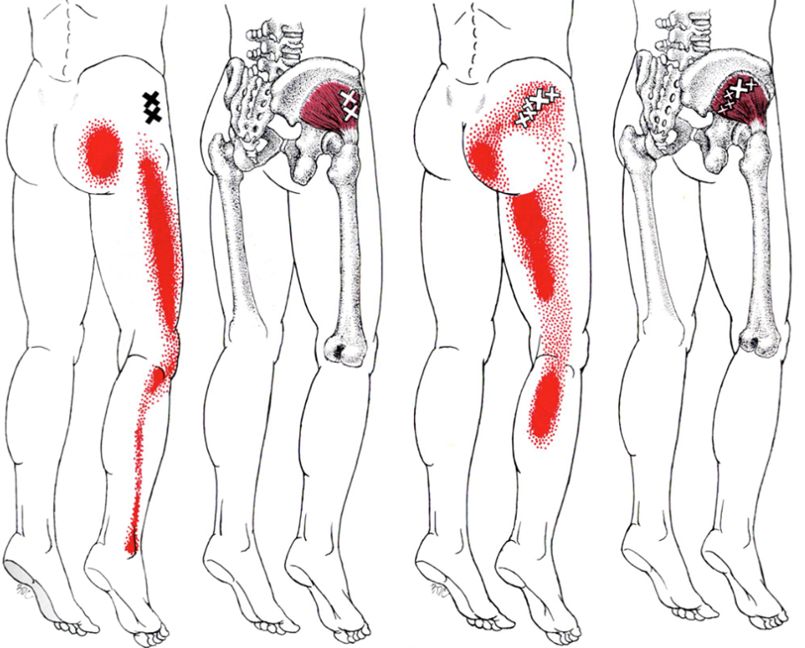=> 골반기준 바깥쪽에 위치한 엉덩이 근육중 중둔근과 소둔근에 트리거포인트(압통점)가 발생했다면 방사통특성상 허리디스크와 매우 비슷한 다리저림증상 및 다리의 무감각 증상과 통증을 일으 킬 수 있습니다. 추가적으로 엉덩이에서 제일 큰 대둔근을 한 겹 걷어내게 되면 보이는 이상근(Pirifomis muscle)은 사람마다 조금씩 다르지만 위치적으로 좌골신경(Sciatic nerve)과 연관이 높습니다. 만약 골반의 불균형이라던지, 주변근육 약화로 과하게 긴장된 경우 좌골신경을 압박하여 허리디스크와 비슷한 통증을 일으킬 수 있습니다.