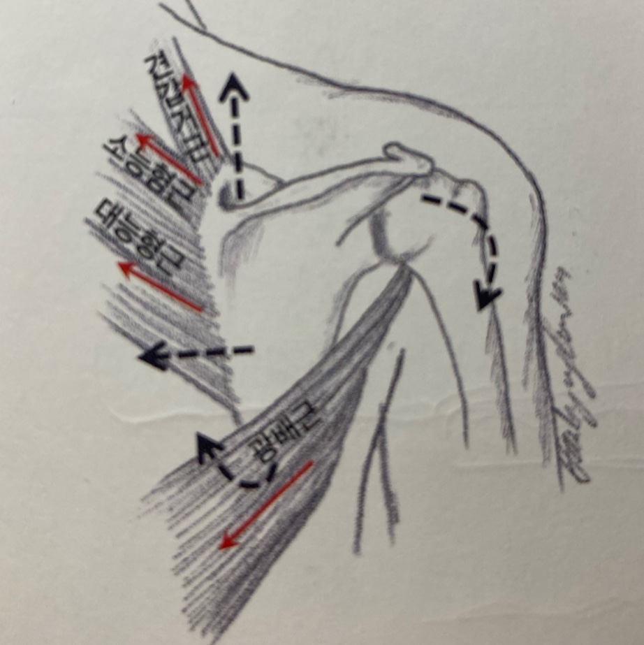 - 대능형근은 견관절와를 아래로 향하게 한다.