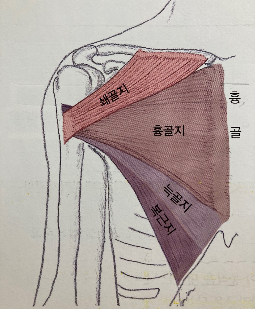 - 단축되면 머리 위쪽으로 상완골의 굴곡과 외전이 제한되고, 소흉근이 함께 단축되면 어깨가 전방으로 하강된다.
