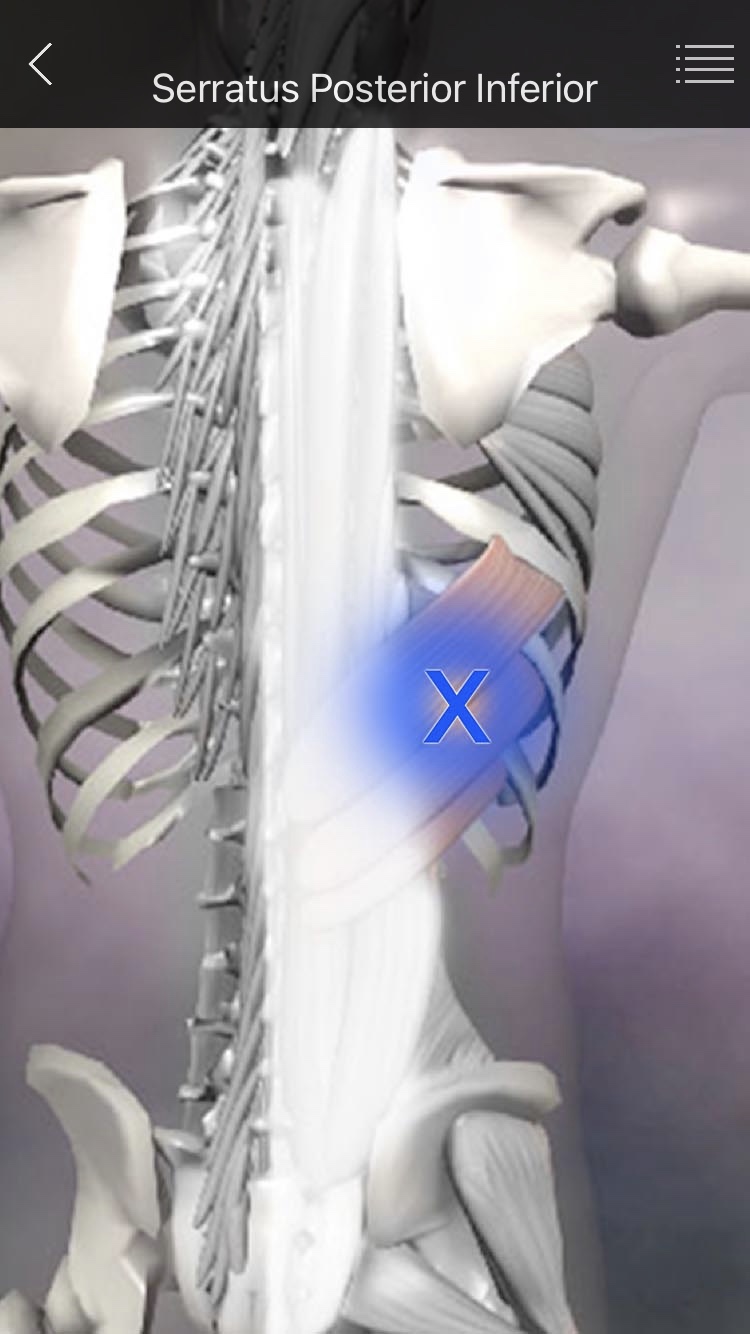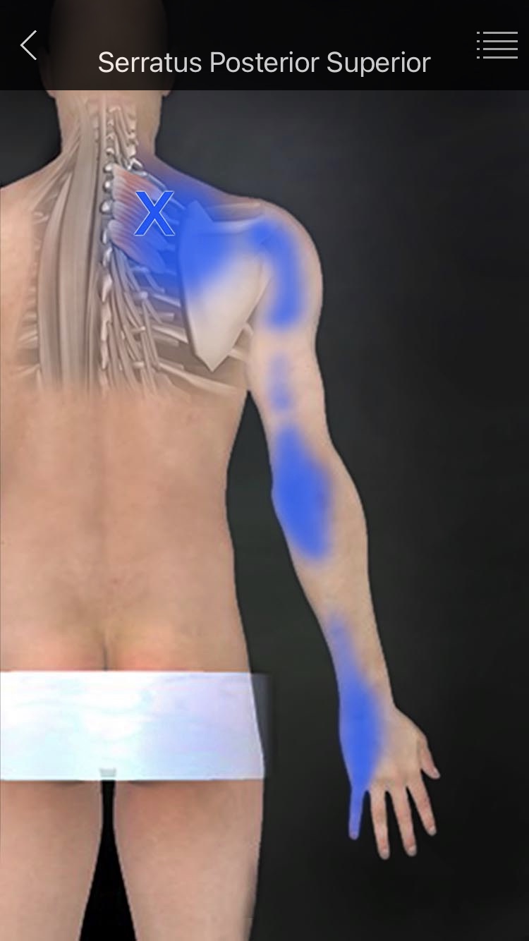 - 후상거근의 정지부(늑골부착부)에 생기는 압통점을 견갑골이 압박하여 통증이 발생한다.