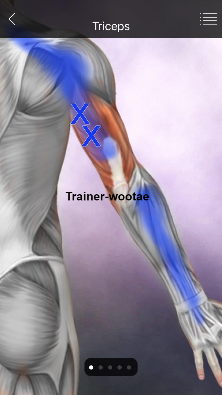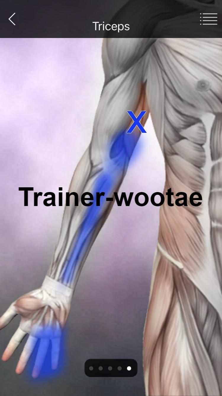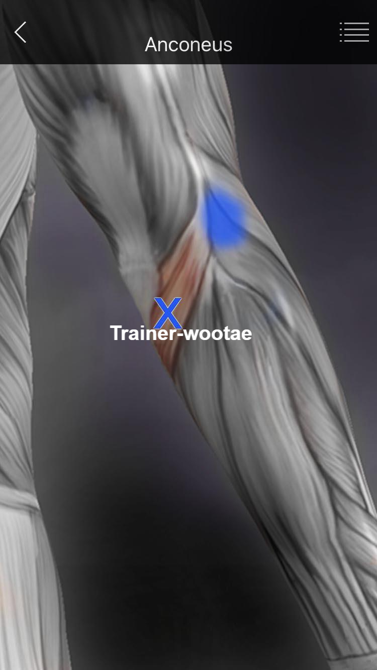 - 테니스 엘보로 의심하여 회외근(Pronator), 상완이두근(Biceps brachii), 상완요골근(Brachialradialis), 장요측수근신근(Extensor carpi radial longus)의 TP를 해결해도 통증이 지속되면 상완삼두근(Triceps brachii)의 내측두(Medial head)와 주근(Anconeus)의 병변을 의심해야 한다.