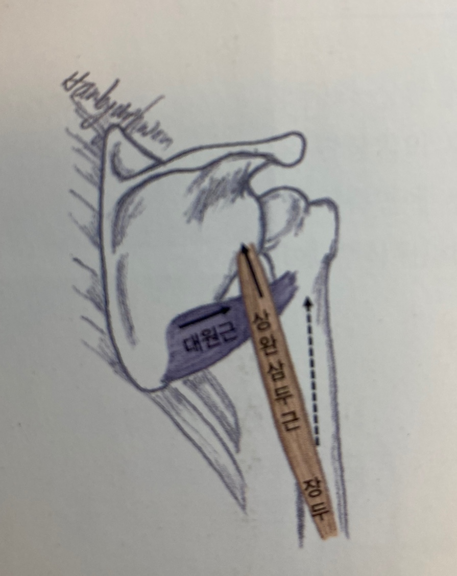- 상완을 90도 외전시킨 상태에서는 상완골두를 견관절와 쪽으로 잡아당긴다.