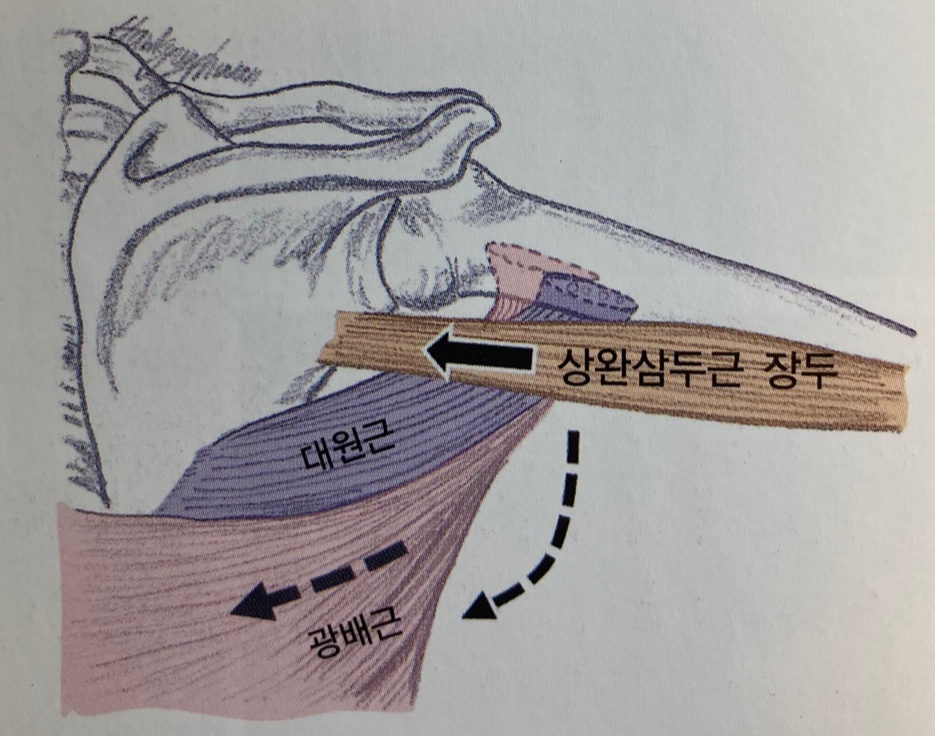 - 상완삼두근의 장두는 상완 내전시 상완골두를 관절와 쪽으로 잡아당긴다.