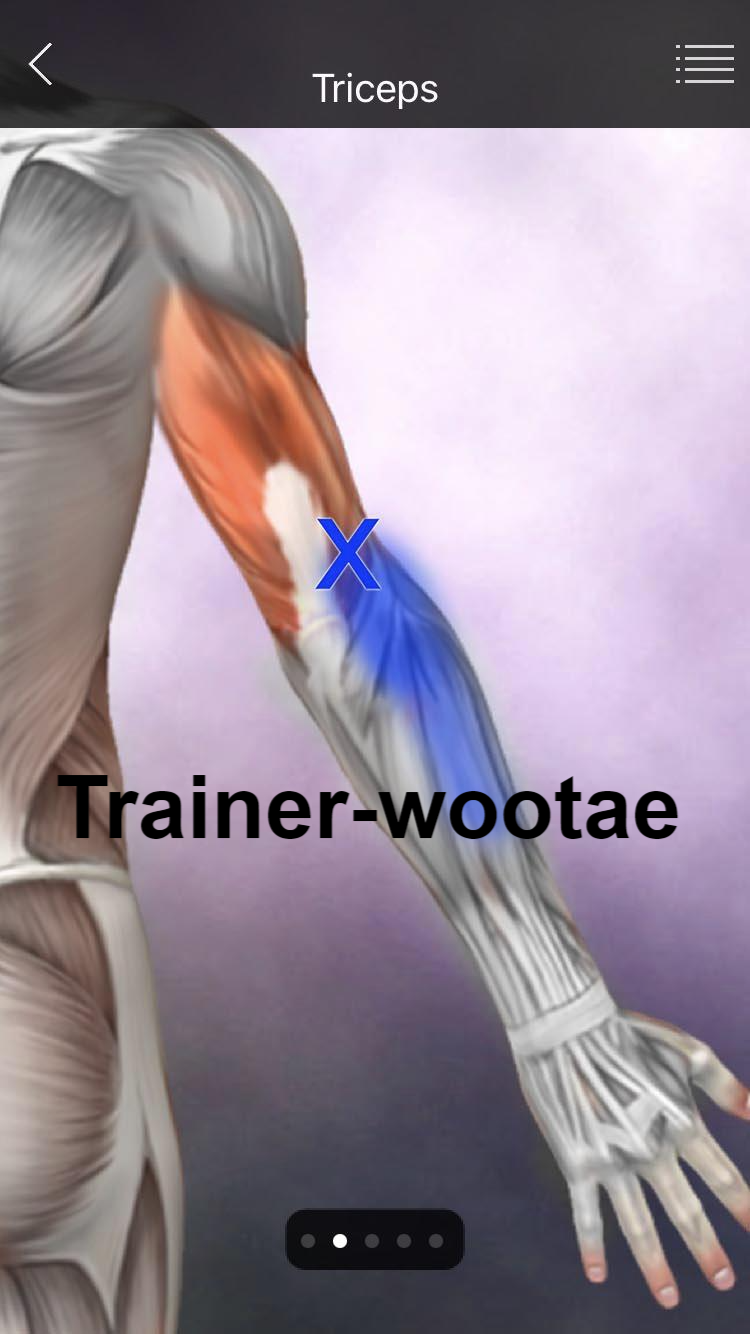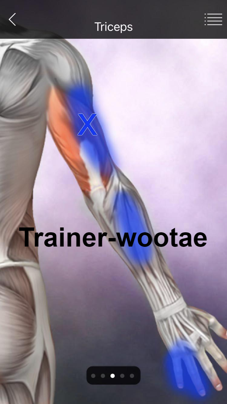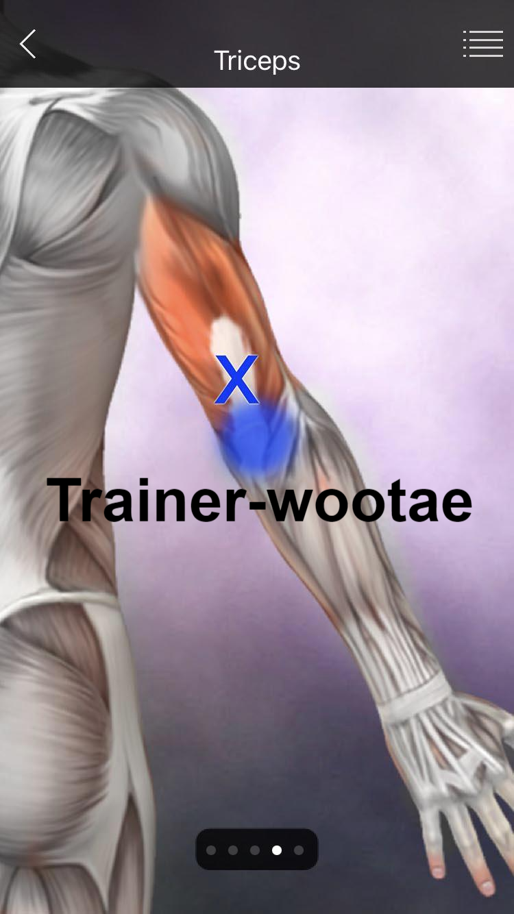 - 테니스 엘보로 의심하여 회외근(Pronator), 상완이두근(Biceps brachii), 상완요골근(Brachialradialis), 장요측수근신근(Extensor carpi radial longus)의 TP를 해결해도 통증이 지속되면 상완삼두근(Triceps brachii)의 내측두(Medial head)와 주근(Anconeus)의 병변을 의심해야 한다.