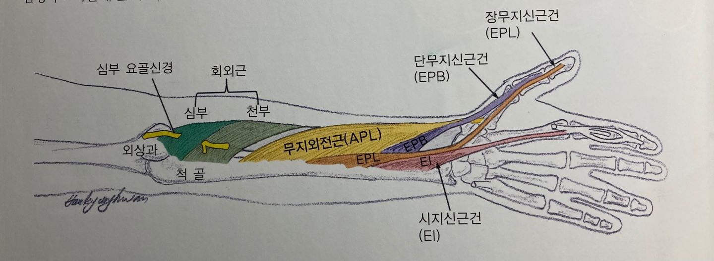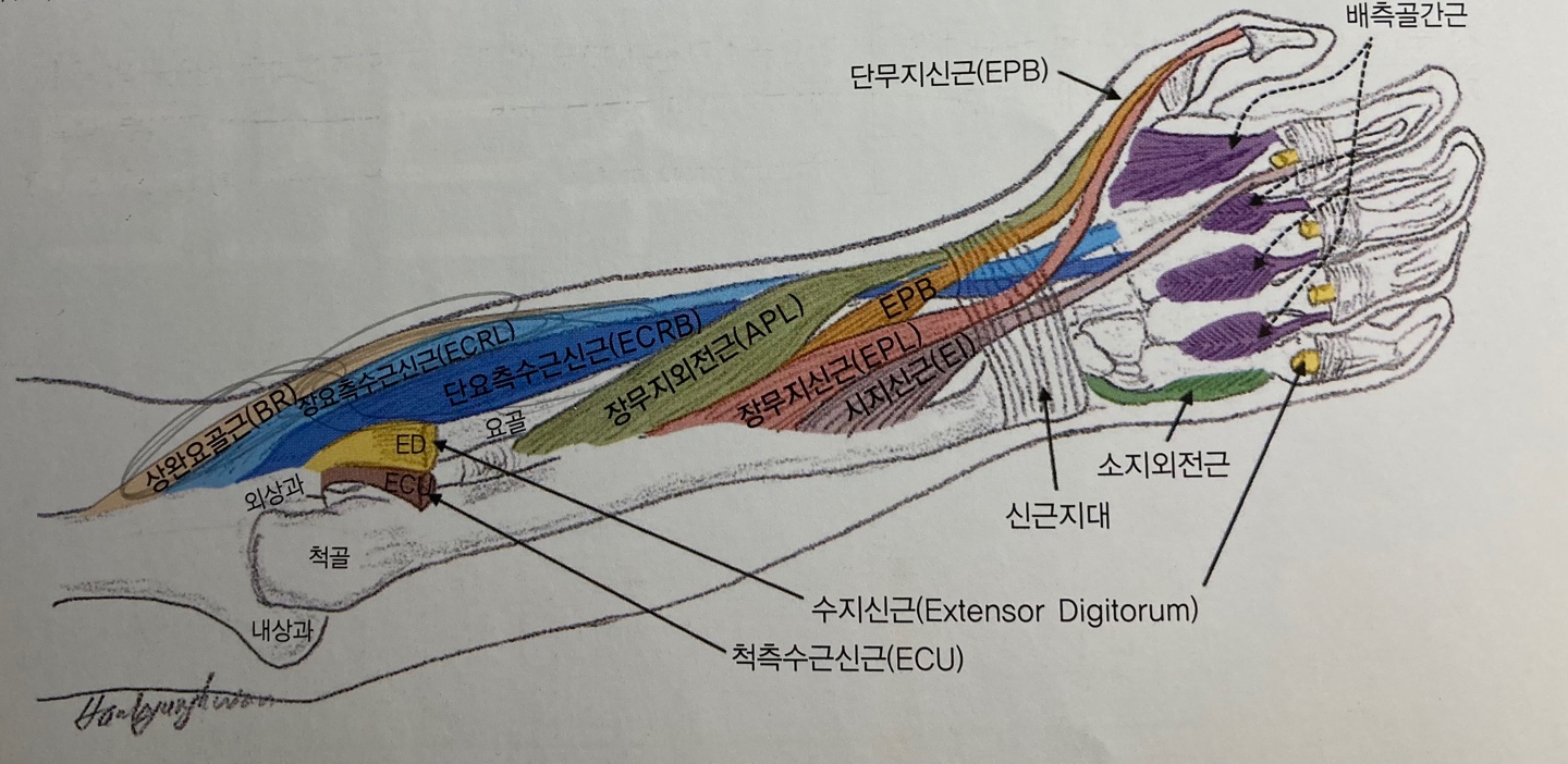 지신근(Extensor digitorum) 기시점(Origin) : - 상완골의 외측상과(Lateral epicondyle of humerus) - 근육간막(Intermuscular septa) - 전완근막(antebrachial fascia) 정지점(Insertion) : - 제2 ~ 5수지의 중지골(2nd ~ 5th middle phalanx) 기저부 - 원위지골(Distal phalanx) 배면부 신경지배 (Innervation) : 요골신경(Radial nerve), C6, C7, C8 근육의 기능 (Function of muslce) : - 제2 ~ 5수지의 신전(Finger extension) - 손목의 신전(Wrist extension) |