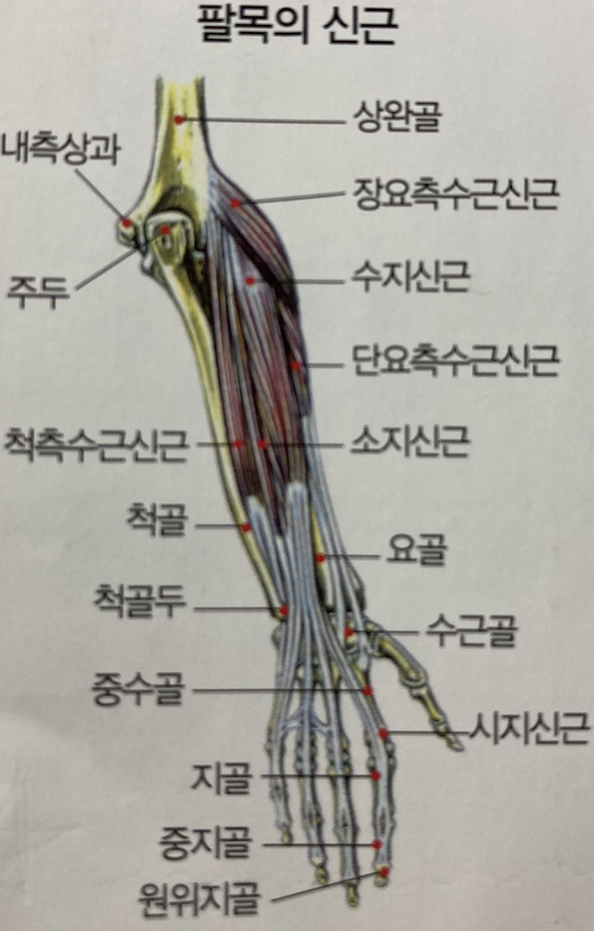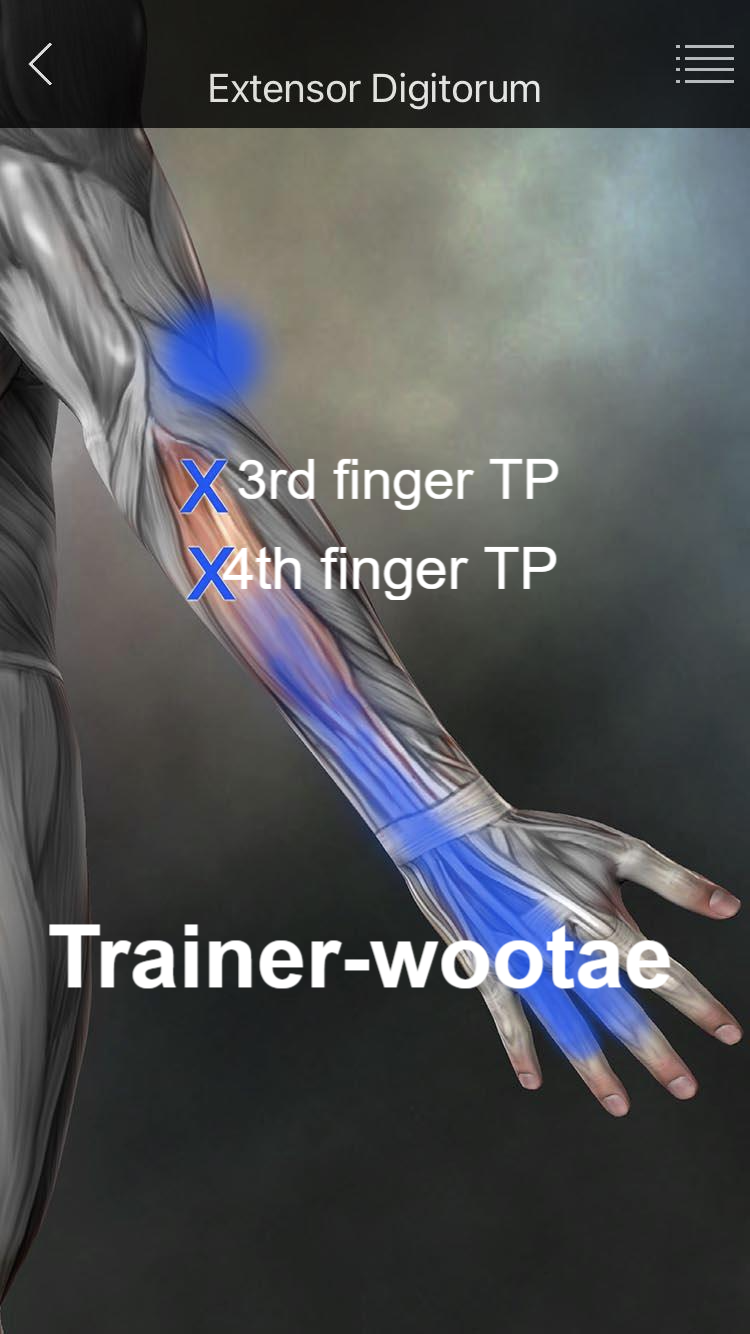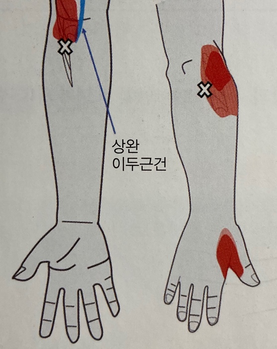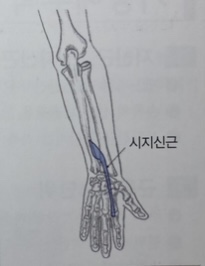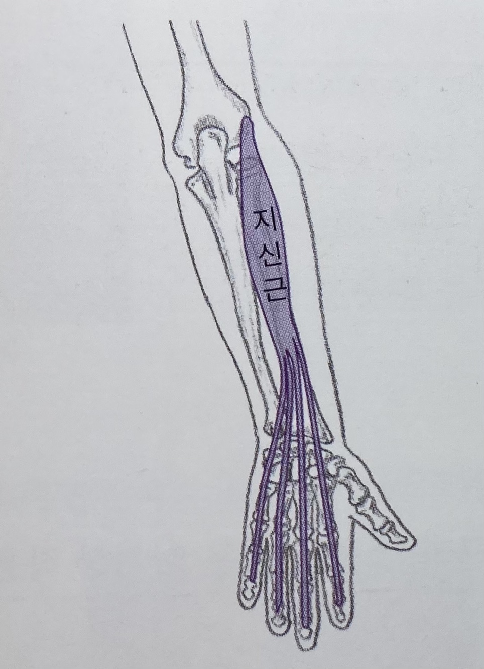 2) 지신근(Extensor digitorum)의 TP에 의해 통증과 함께, 수지 굴곡의 장애가 생길 수 있다.
