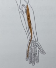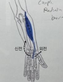 - 검수자는 앉은 자세에서 주관절은 신전, 전완은 회내시키고, 손가락은 모두 굴곡시킨 상태에서, 손목을 요측으로 신전시킨다.