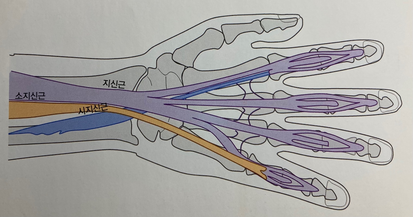 3) 중지신근만 단독으로 이환된 경우 통증은 없이 파악력(손을 쥐는 힘)만 약해진다.