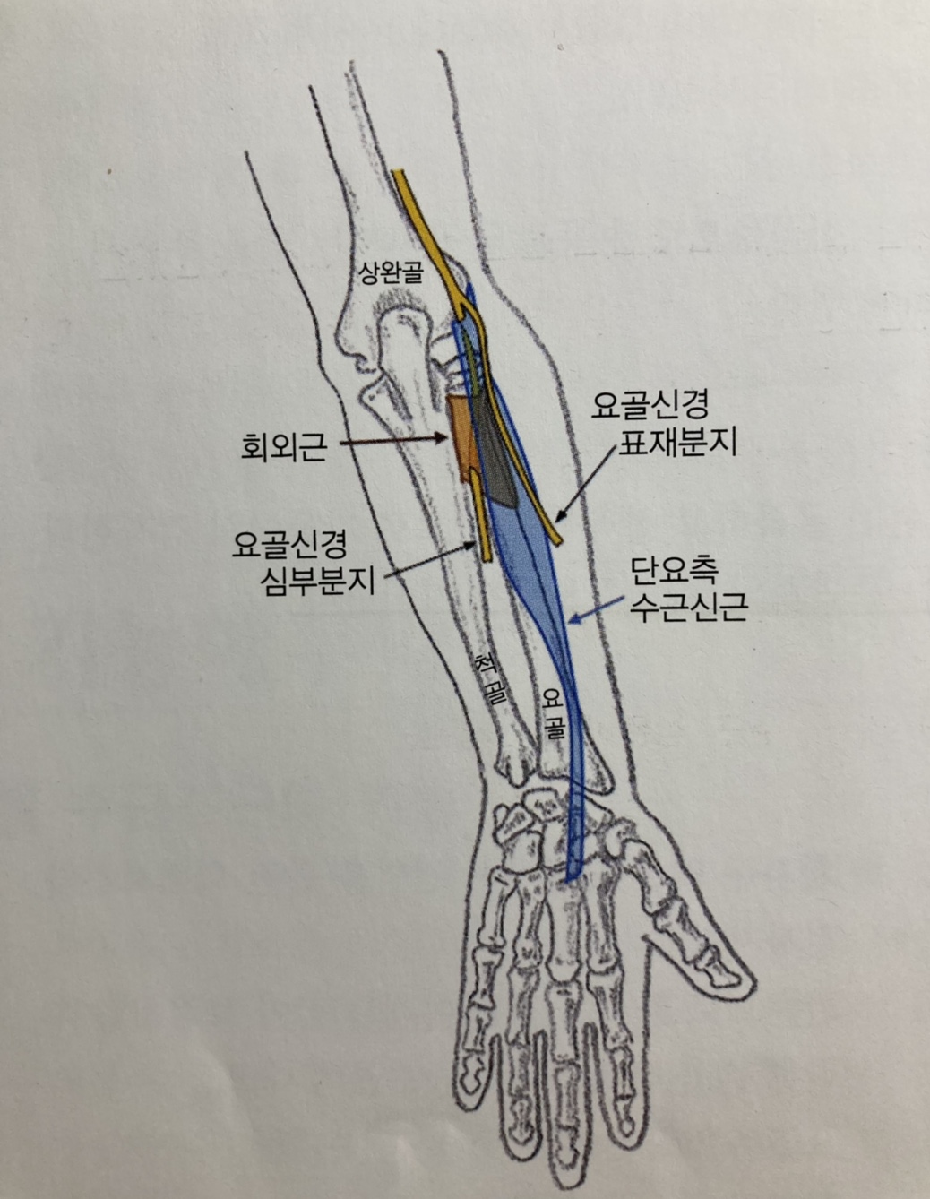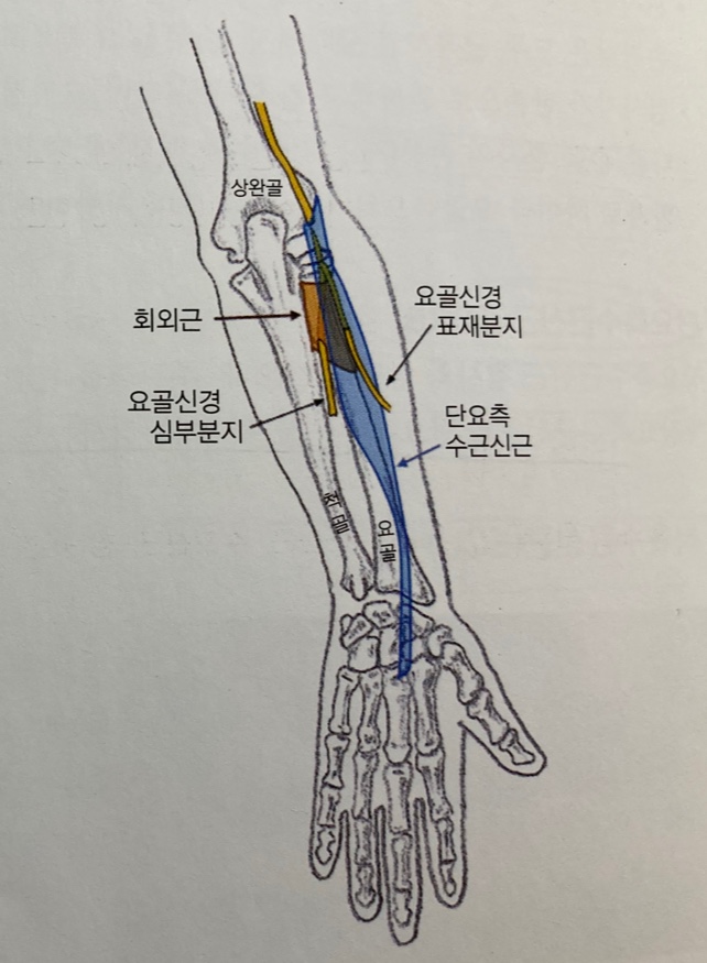- 표재신경(감각지)이 심부신경에서 분지되는 경우 단요측수근신근을 뚫고 나온다. 근육의 TP가 신경압박을 하면 엄지와 손의 배면부에 감각이상을 초래할 수 있다.