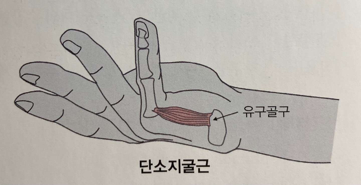 | 3. 단소지굴근(Flexor digiti minimi) 기시점(Origin) : 유구골구(Hook of hamate), 굴근지대(Flexor retinaculum) 정지점(Insertion) : 소지 근위지골 기저부의 척측 신경지배(Innervation) : 척골신경, C7, C8, T1 작용(Action) : - 소지 중수지절관절의 굴곡(Flexion) - 대립(Opponen)을 보조 |