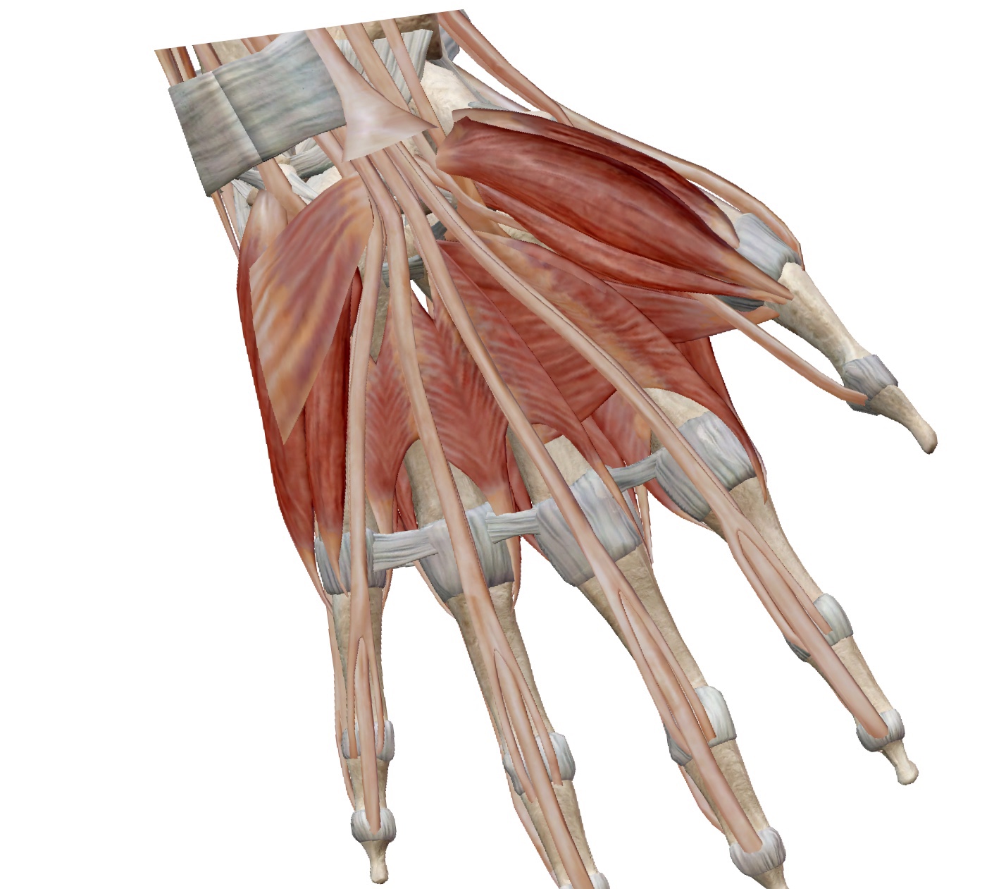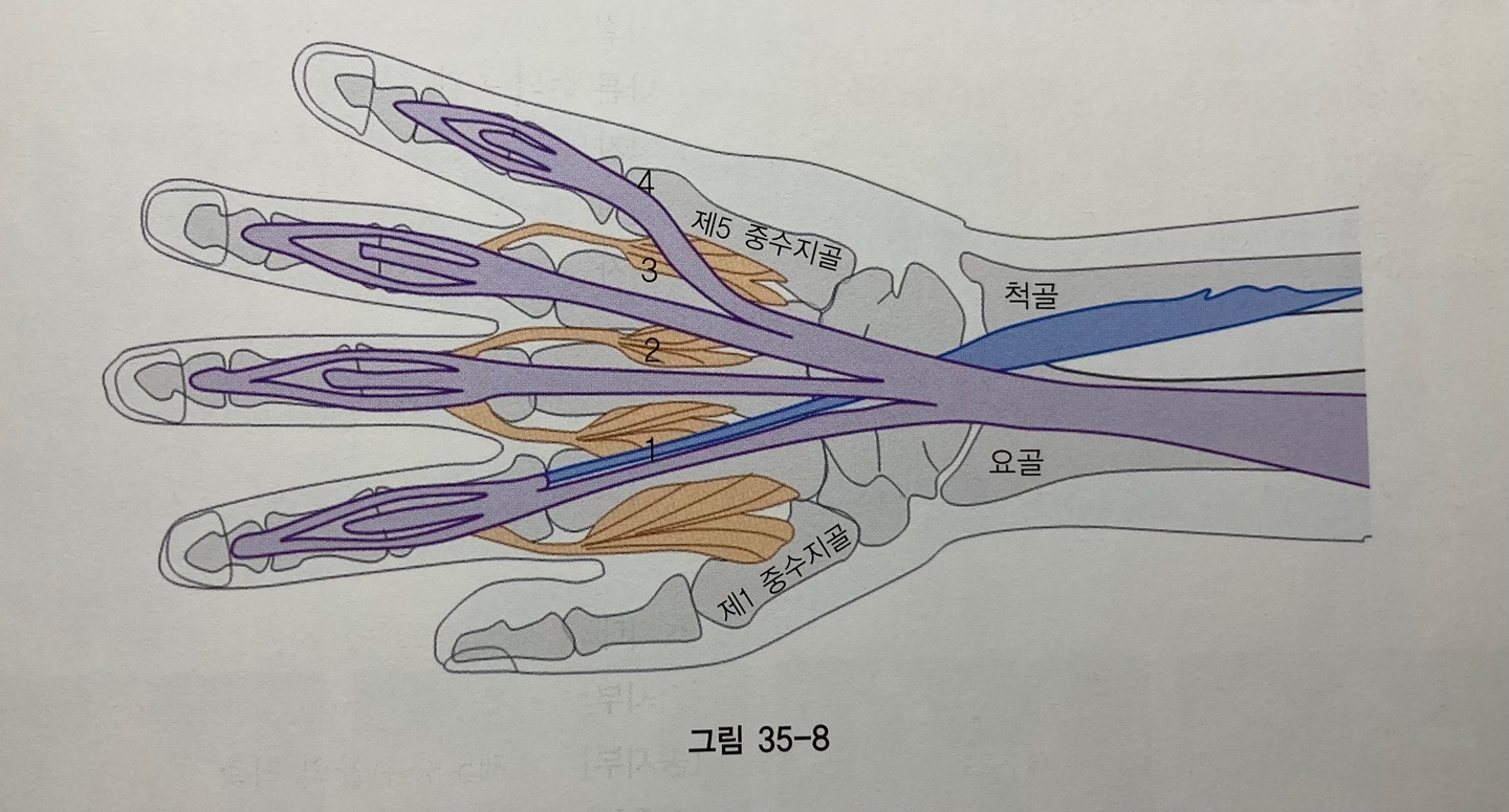 | 7. 충양근(Lumbricalis) 기시점(Origin) : - 제1 충양근(Lumbricalis) : 제2 수지로 가는 심지굴근건의 요측 - 제2 충양근(Lumbricalis) : 제3 수지로 가는 심지굴근건의 요측 - 제3 충양근(Lumbricalis) : 제3 수지로 가는 심지굴근건의 척측, 제4수지로 가는 심지굴근건의 요측 - 제4 충양근(Lumbricalis) : 제4 수지로 가는 심지굴근건의 척측, 제5 수지로 가는 심지굴근건의 요측 정지점(Insertion) : - 제1 충양근(Lumbricalis) : 해당 수지의 수지신전건의 요측 - 제2 충양근(Lumbricalis) : 해당 수지의 수지신전건의 요측 - 제3 충양근(Lumbricalis) : 해당 수지의 수지신전건의 요측 - 제4 충양근(Lumbricalis) : 해당 수지의 수지신전건의 요측 신경지배(Innervation) : 정중신경(Median nerve), C6, C7 작용(Action) : 해당 수지의 중수지관절 굴곡(Flexion), 지골관절 신전(Extension) |