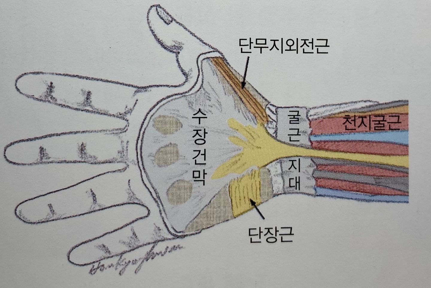 | 1. 단장근(Palmaris brevis) 기시점(Origin) : 수장건막(Palmar aponeurosis)의 척골연과 굴근지대(Flexor retinaculum)의 수장면 정지점(Insertion) : 손의 척골연 위의 피부 신경지배(Innervation) : 척골신경(Ulnar nerve), C7, C8, T1 작용(Action) : 피부를 손의 척골방향으로 주름지게 한다. |