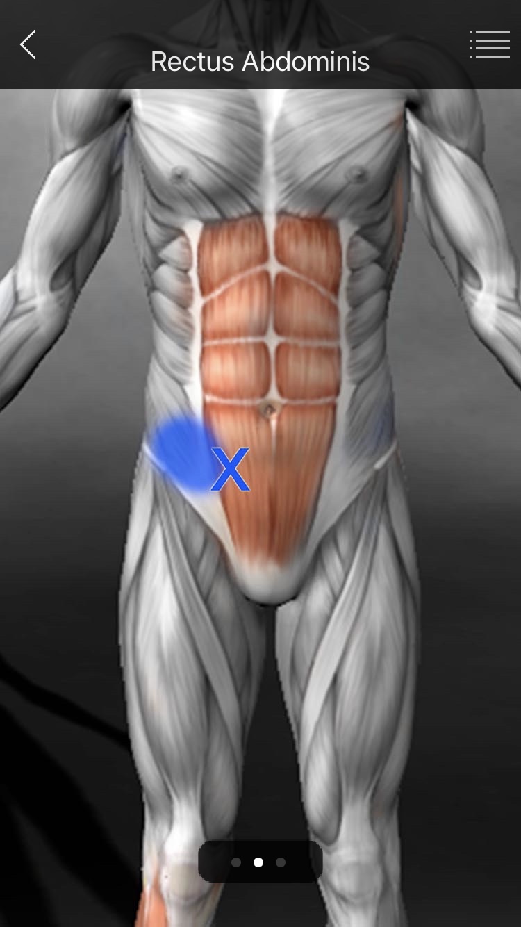 1. 복직근(Rectus abdominis) ● 상복부(Upper abs) => TP 늑골궁(Costal arch)과 검상돌기(Xiphoid process) 사이의 각진 곳 또는 검상돌기와 배꼽사이에 위치한다. => 방사통 흉요부의 양측으로, 옆으로 줄을 그은 듯한 통증이 생긴다. (일측성 통증인 경우 광배근이 원일일 가능성이 높다.) 검상돌기 부위로 통증을 전이시켜, 소화기 증상을 유발할 수 있다. - 복부팽만 - 속쓰림 - 소화불량 - 오심 - 구토 ※ 양쪽 수평방향의 요통은 심호흡시 약화된다. - 특히 요추전만시에는 복직근이 더 스트레칭되므로 심하다. - 척추주위근에 의한 요통이라면 호흡에 따른 변화는 없다. ● 하복근(Lower abs) TP는 배꼽과 치골결합(Pubic symphysis) 사이의 중간에 위치하고, 생리통과 관계가 있으며, 방사통은 양측 천장골과 요추부를 가로질러 생긴다. ※ 우측 복직근의 하방TP는 McBurney's point에 위치하여, 급성충수염(맹장통)의 통증과 유사하다. 장골와, 둔근, 음경으로 예리한 통증을 만들기도하고, 설사, 게실염, 부인과적인 문제를 일으키기도 한다. 치골위의 TP는 배뇨근과 요도괄약근의 경직을 야기할 수 있다. |