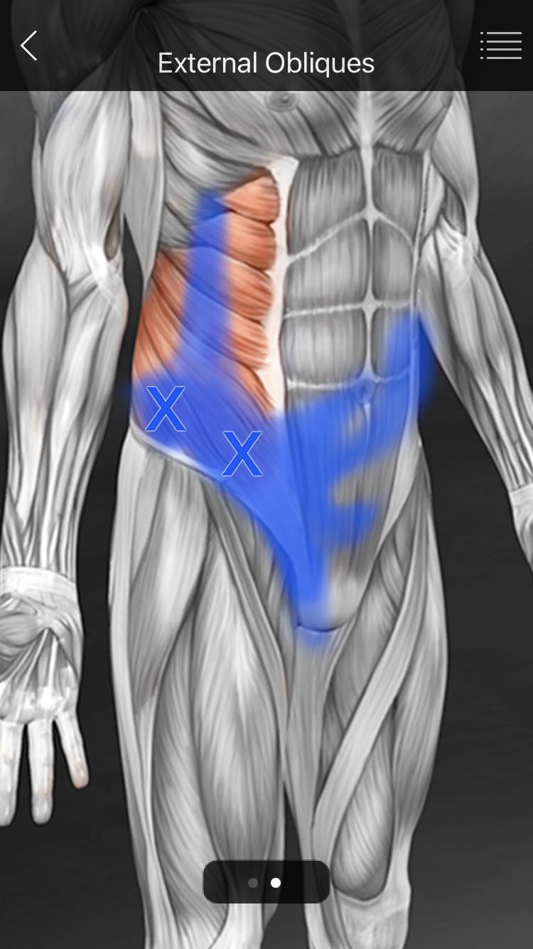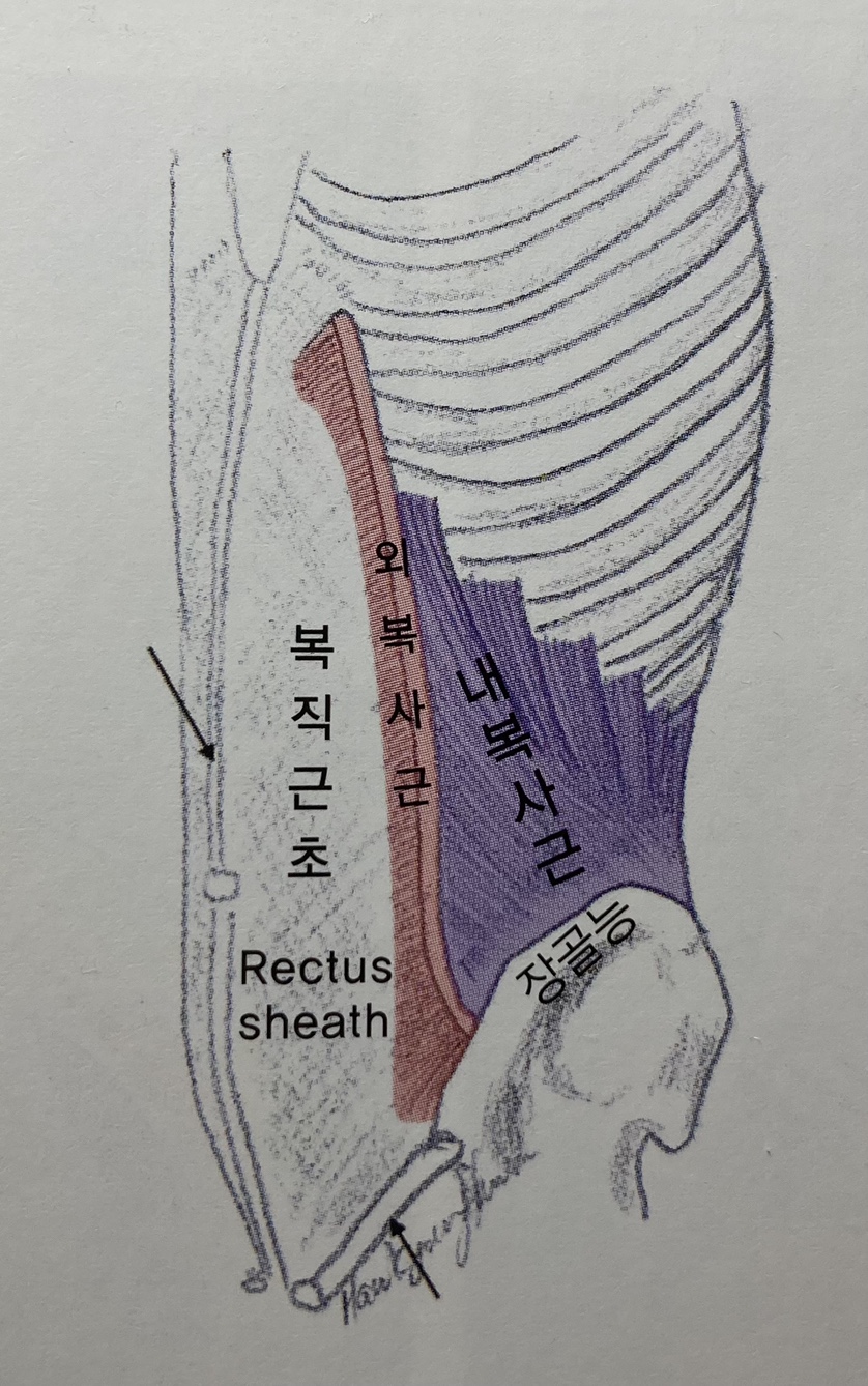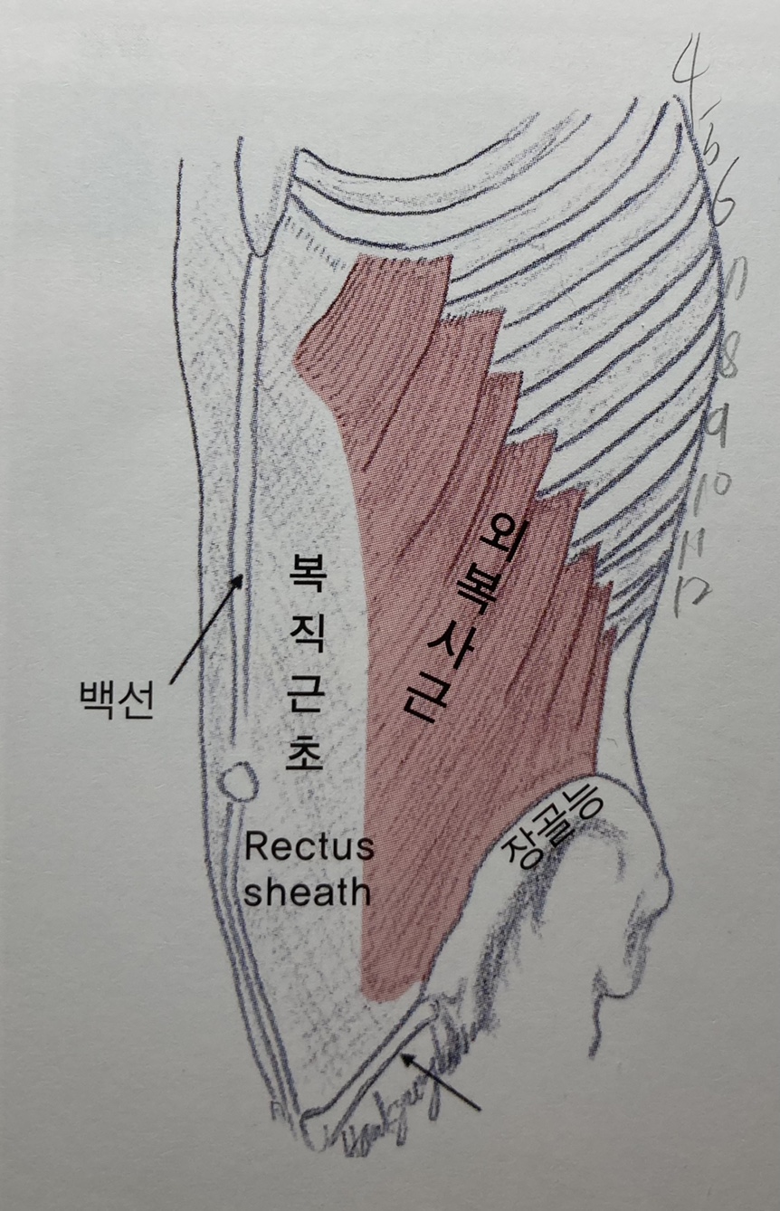 3. 외복사근(External oblique abdominis) 기시부(Origin) - 백선(Linea line) - 장골능(Iliac crest)의 앞쪽 1/2 정지부(Insertion) - 하부 8개 늑골의 하연 ※ 위쪽 5개는 전거근(Serratus anterior)과 섞이고, 아래3개는 광배근(Latissimus dorsi)과 섞인다. 작용(Action) - 일측 작용시 : 측굴(Side band)과 반대측회전(Rotation) - 양측 작용시 : 척추의 굴곡, 복압증가 신경지배(Innervation) - 장골하복신경(Iliohypogastric nerve) - 장골서혜신경(Ilioinguinal nerve) - 늑간신경(Intercostal nerve) |