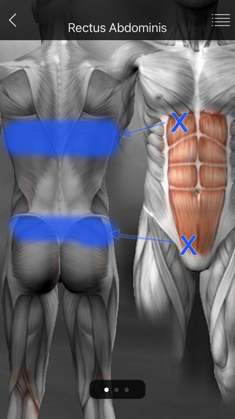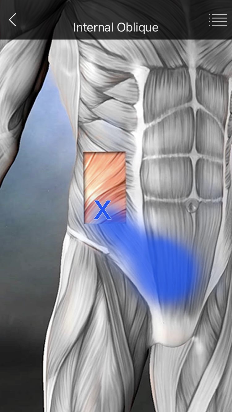 1. 복직근(Rectus abdominis) ● 상복부(Upper abs) => TP 늑골궁(Costal arch)과 검상돌기(Xiphoid process) 사이의 각진 곳 또는 검상돌기와 배꼽사이에 위치한다. => 방사통 흉요부의 양측으로, 옆으로 줄을 그은 듯한 통증이 생긴다. (일측성 통증인 경우 광배근이 원일일 가능성이 높다.) 검상돌기 부위로 통증을 전이시켜, 소화기 증상을 유발할 수 있다. - 복부팽만 - 속쓰림 - 소화불량 - 오심 - 구토 ※ 양쪽 수평방향의 요통은 심호흡시 약화된다. - 특히 요추전만시에는 복직근이 더 스트레칭되므로 심하다. - 척추주위근에 의한 요통이라면 호흡에 따른 변화는 없다. ● 하복근(Lower abs) TP는 배꼽과 치골결합(Pubic symphysis) 사이의 중간에 위치하고, 생리통과 관계가 있으며, 방사통은 양측 천장골과 요추부를 가로질러 생긴다. ※ 우측 복직근의 하방TP는 McBurney's point에 위치하여, 급성충수염(맹장통)의 통증과 유사하다. 장골와, 둔근, 음경으로 예리한 통증을 만들기도하고, 설사, 게실염, 부인과적인 문제를 일으키기도 한다. 치골위의 TP는 배뇨근과 요도괄약근의 경직을 야기할 수 있다. |