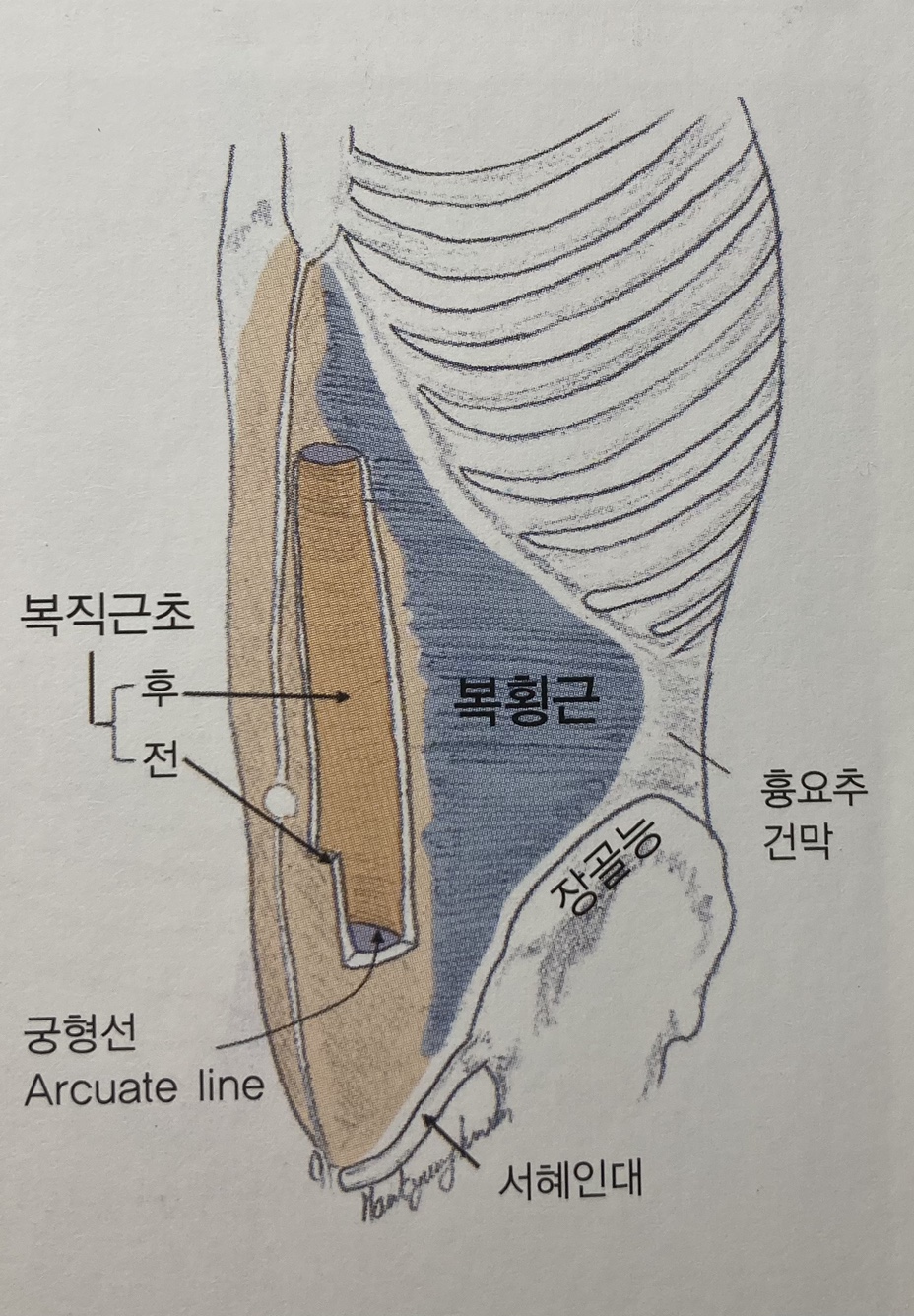 - 반대측 내복사근, 후하거근