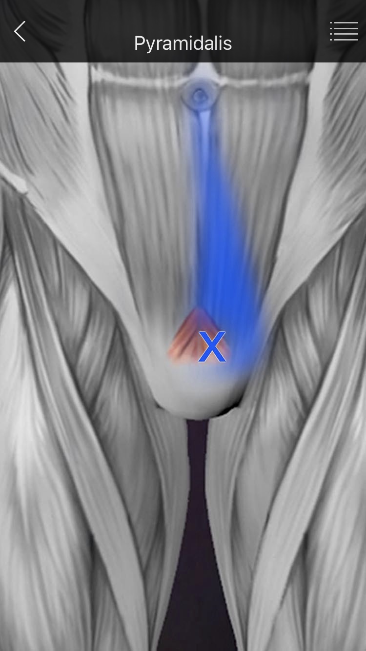 5. 추체근(Pyramidalis) - 배꼽과 치골결합(Pubic symphysis)사이의 중간부위에 방사통이 생긴다. |