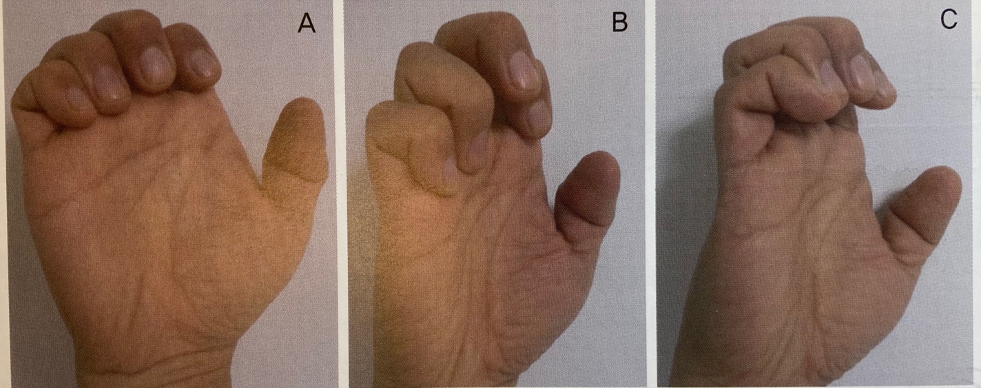중수지관절(Metacarpophalangeal joint)을 최대한 신전시킨 상태에서 손가락 관절만 굴곡시켜본다.