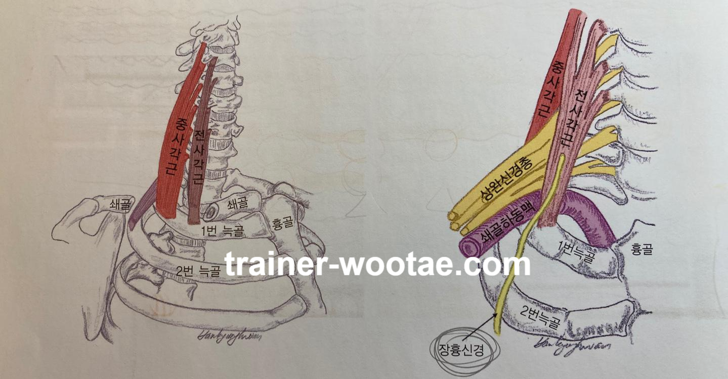 - 쇄골과 제1늑골 사이에 신경, 혈관 다발의 압박을 함 => 군대 차렷 자세처럼 어깨를 뒤로 젖히면 압박이 증가된다.