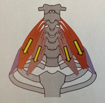 - 늑골의 종지부가 고정된 상태에서 양쪽 사각근이 수축하면 경추가 전굴 된다. | |