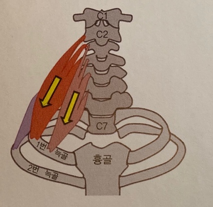 - 경추의 기시부가 고정된 상태에서 양쪽 사각근이 수축하면 제1, 2번 늑골을 들어 올리게 된다. - 흉쇄유돌근과 함께 흡기운동을 보조한다. |