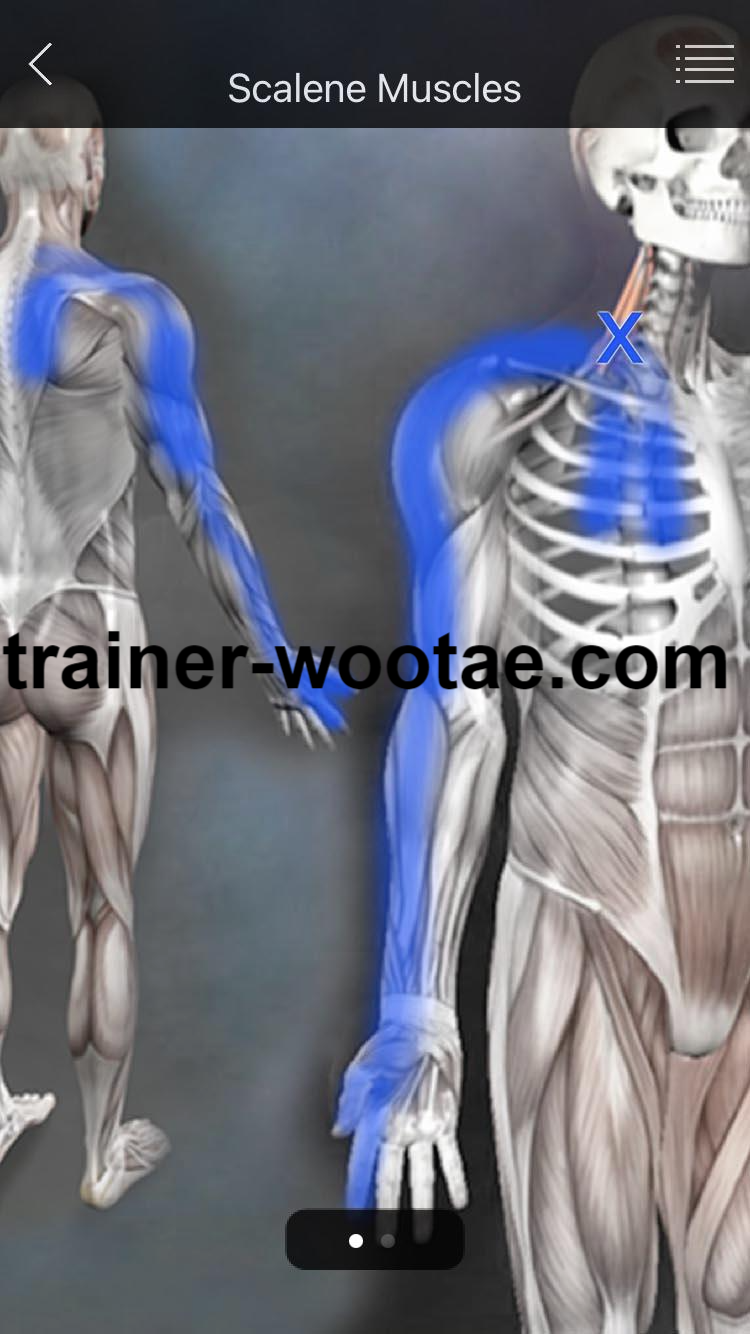 - 좌측 중사각근의 TP에 의한 연관통이 좌측의 팔로 방사되면 협심증과 혼동될 수 있다.