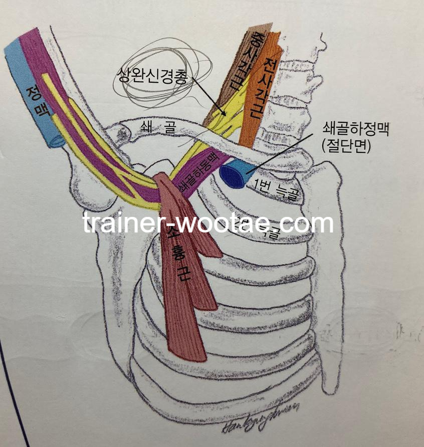 - 쇄골과 제1늑골 사이에 신경, 혈관 다발의 압박을 함 => 군대 차렷 자세처럼 어깨를 뒤로 젖히면 압박이 증가된다.