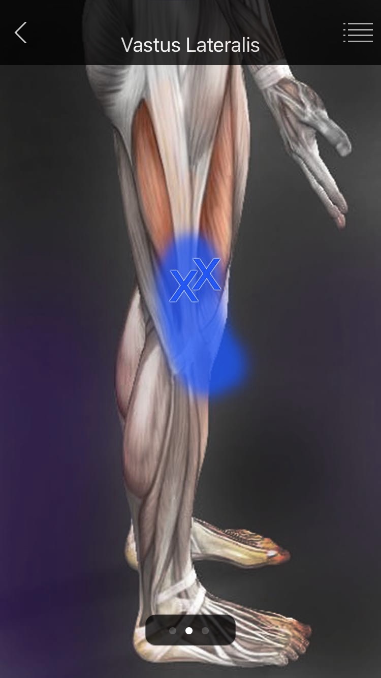 | 외측광근은 대퇴사두근 중에서 가장 큰 근육이므로, 대퇴의 외측면을 따라 슬관절 외측에 이르기까지 근육 길이의 전반에 걸쳐 다발성으로 TP가 생기며, 외측광근의 대퇴 전외측의 중간부는 두껍고, 중간광근과 근섬유가 섞여있다. ● TP1 - 슬개골 외측면 주위에서 허벅지 외측에 이르는 연관통 및 "고정된 슬개골(Locked patella)"을 유발한다. - 무릎 뒤쪽에 이르는 통증을 일으킨다. ● TP2 - TP와 방사통이 모두 TP1의 후방에 위치 - 슬개골 외측에서, 위아래로 대퇴와 하퇴 외측에 이르는 광범위한 방사통을 만든다. ● TP3 - 대퇴의 중간 높이에 TP가 있다 - 무릎 후방인 햄스트링 외측 1/2을 포함하여, 대퇴 후외측 전체에 방사통을 야기한다. (대퇴사두근의 TP가 무릎 후방의 통증을 야기할 수 있다.) ● TP4 - 대퇴 외측에서 약간 앞쪽에 위치. (TP와 방사통이 모두 TP3보다 앞쪽에 있음) - 위로는 대퇴 외측의 전체 길이에 걸쳐, 장골능까지 심한 통증을 야기하고, 아래로는 슬개골 외측연의 전면을 감싸듯이 내려온다. ● TP5 - 외측광근 근위부의 끝부분에 위치 - 방사통은 TP 주변으로만 나타난다. - TP4와 복합되면 외측광근의 전면으로 방사통이 생긴다. ※ 근위부에 TP가 있는 경우 - 이환된 쪽으로 눕지 못하여 밤에 잠을 설치게 된다. - 대전자에 방사통이 생긴 경우는 활액막염의 증상과 비슷하다. - 소둔근과 대퇴근막장근이 이환된 경우에도 통증의 양상이 비슷하므로 구분이 필요하다. ※ 원위부에 TP가 있는 경우 - 슬개골의 움직임을 제한하므로 "고정된 슬개골(Locked patella)"을 유발한다 - 무릎이 약간 굴곡된 상태로, 완전히 펼 수도 없고 5도 이상 굽힐 수도 없어서 걷거나 길수도 없고, 아래에 발받침이 없는 의자에 앉기도 곤란하다. - 비골측부인대의 TP때문에 생기는 무릎 외측의 통증과 유사하므로 구분해야 한다. |