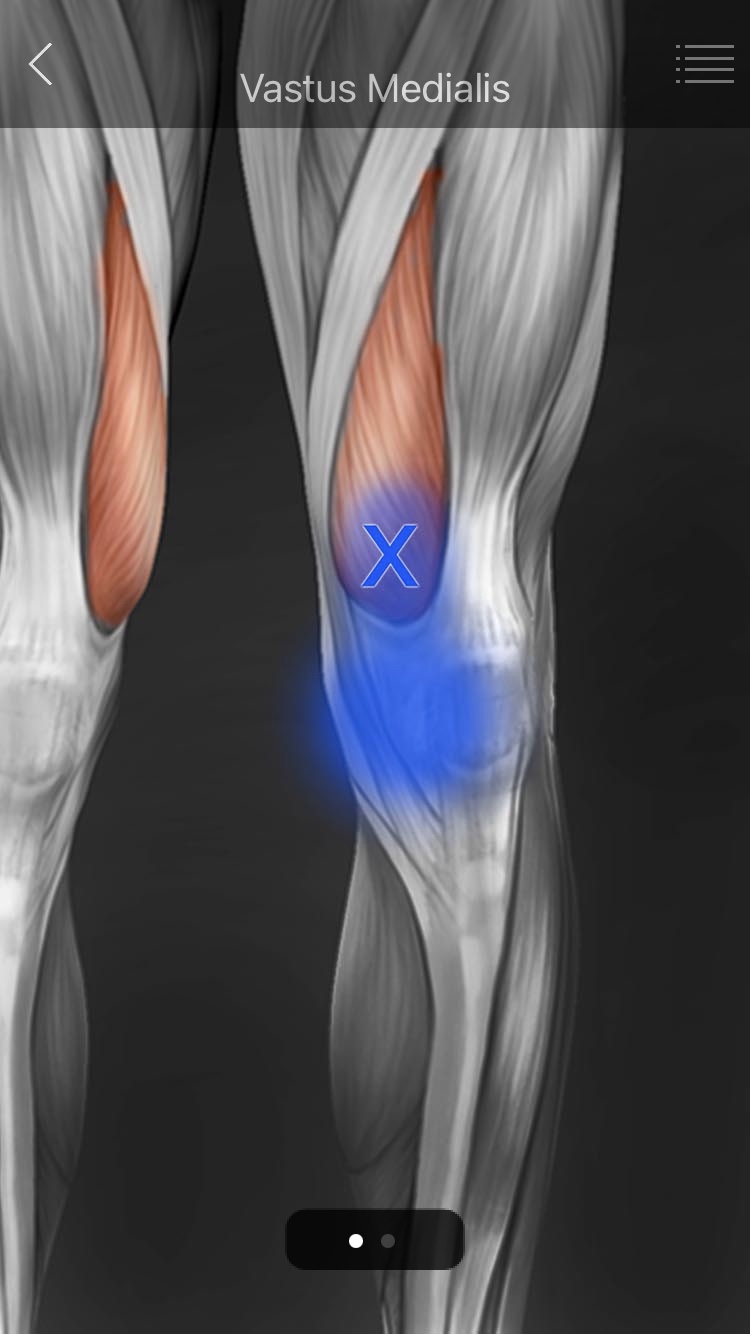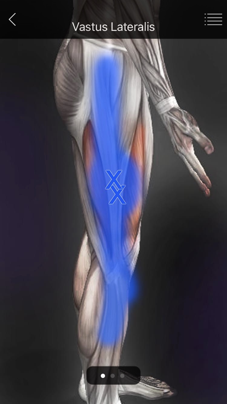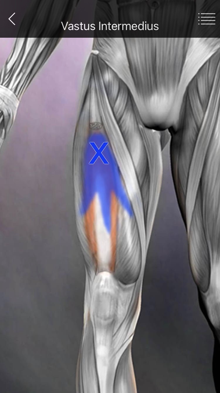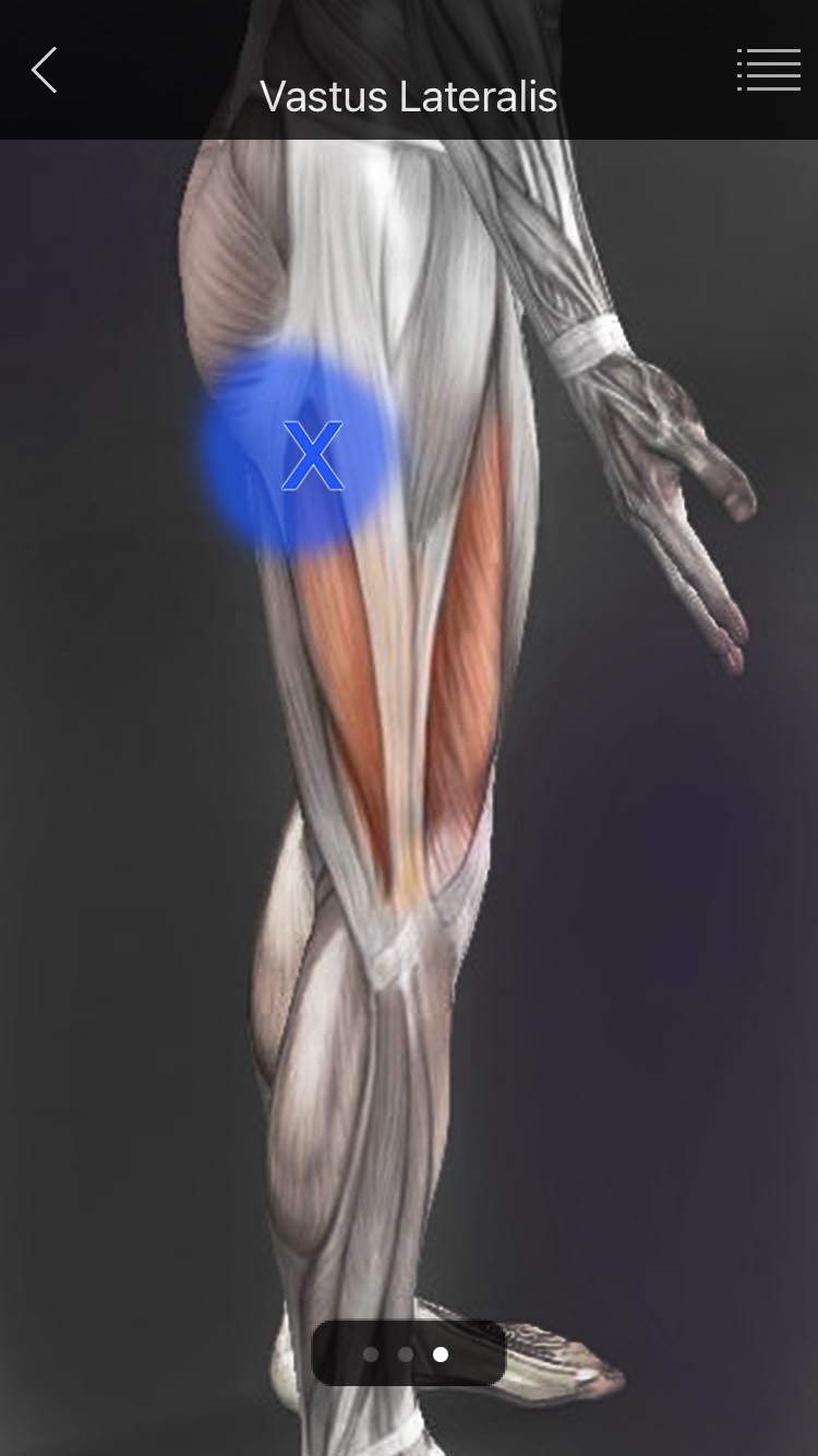 ● TP - 대퇴직근의 TP보다 약간 원위부에서, 대퇴직근의 아래 심부에 위치한다. 중간광근 단독으로는 거의 발생하지 않고 주변 근육에 의해 2차적으로 발생한다. ● 방사통 - 대퇴 근위부의 전외측면에서 무릎의 앞쪽까지 방사통을 유발한다. (대퇴의 중간부분이 통증이 가장 심함.) |
