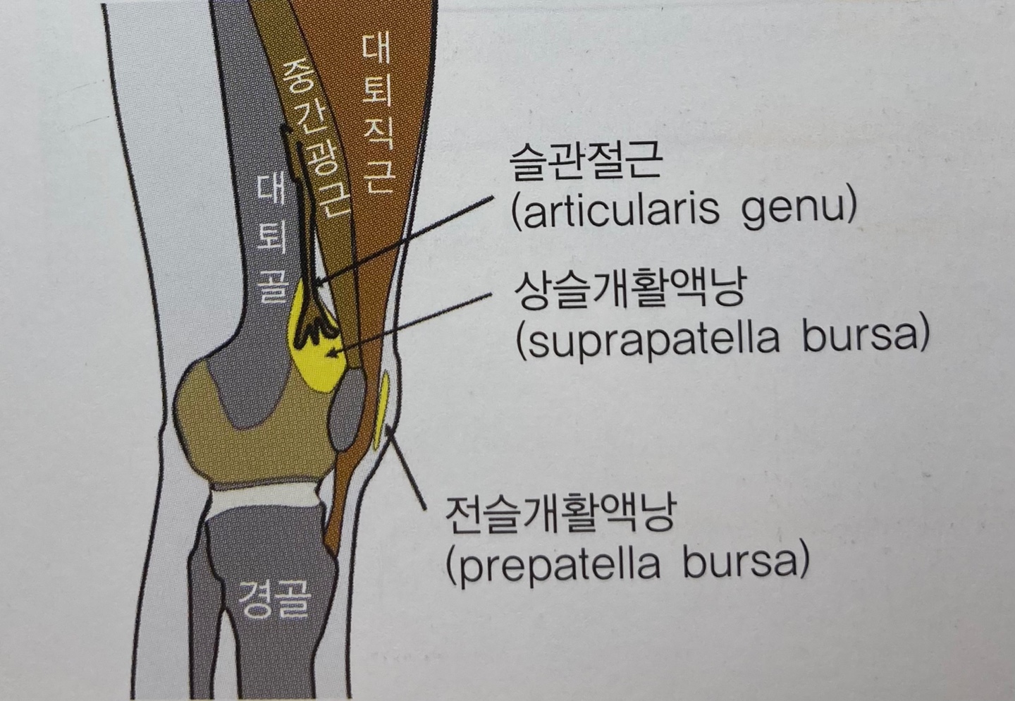 => 외측광근(Vastus lateralis)은 내측으로의 이동을, 내측광근(VMO)은 외측으로의 이동을 제한하고, 중간광근(Vastus intermedius)은 슬개골 상극의 양쪽 회전을 제한한다.