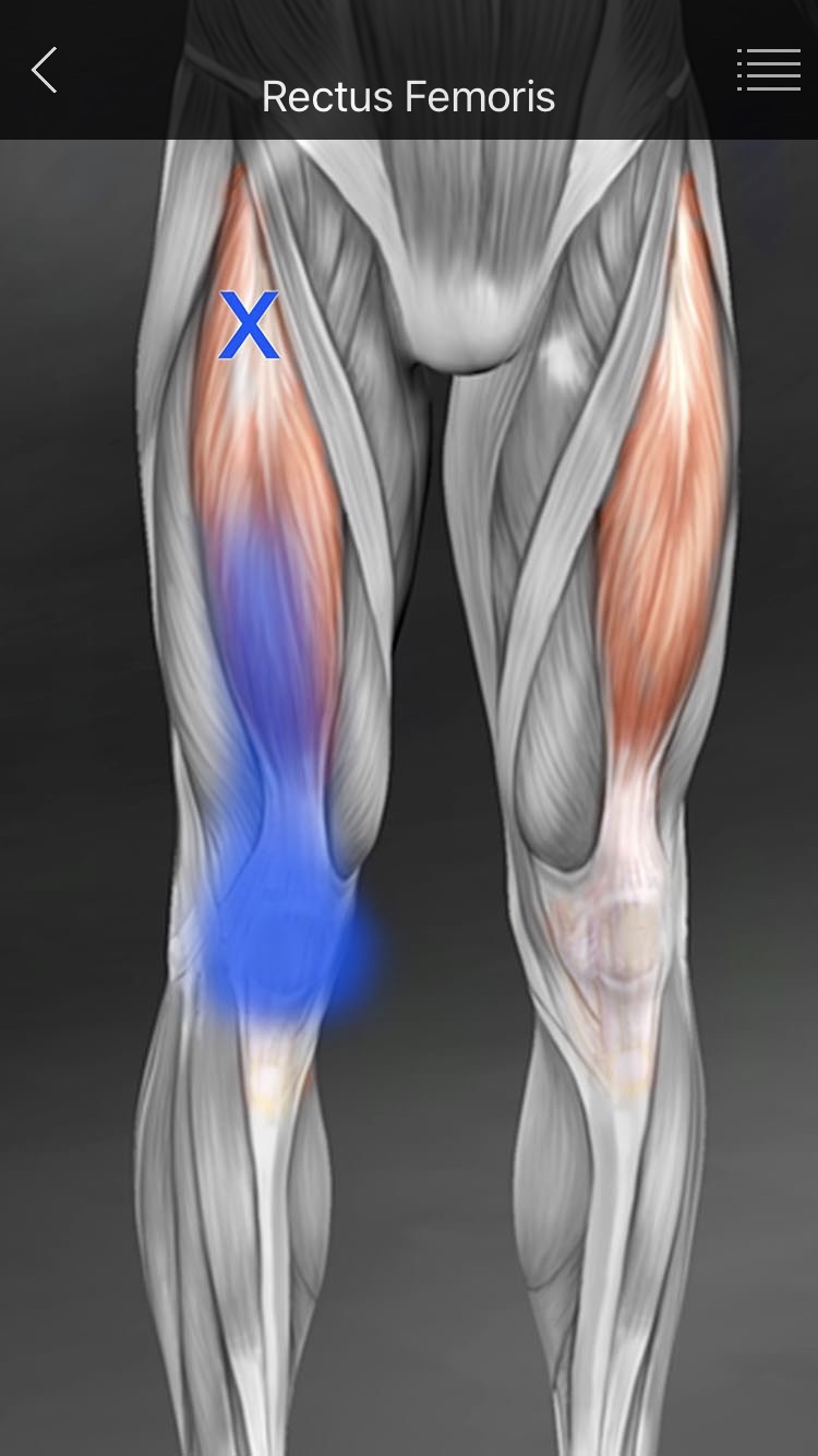 - TP는 고관절과 전상장골극 직하방 상부대퇴부에 존재하고, 슬개골 근처나 슬관절 심부의 깊은 통증을 방사한다. (밤에 무릎 앞쪽으로 쑤시는 통증) - 대퇴직근의 TP는 고관절과 전상장골극 바로 아래의 상부 대퇴부에 생기지만, 방사통은 대퇴 전면부와 슬관절의 심부에서 느껴진다. 대퇴 전면부와 무릎 안쪽의 쑤시는 통증 때문에 밤에 자다가 깨거나, (대퇴직근이 신장되지 않도록) 옆으로 돌아누워 무릎을 펴고 고관절을 구부려 자야한다. - 근력이 약화되어 계단을 내려갈 때 힘들어 한다. |