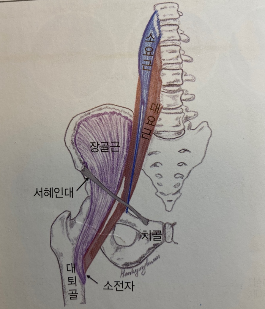● 대요근(Psoas major) - 기시점(Origin) : L1~L5 횡돌기, T12~L5의 추체와 추간판 - 정지점(Insertion) : 대퇴골 소전자 - 작용(Action) : 요추 신전, 고관절 굴곡 - 신경지배(Innervation) : L2, L3, L4, 요추신경 ● 소요근(Psoas minor) - 기시점(Origin) : T12, 상부1~2개 요추의 전외측 - 정지점(Insertion) : 치골상지의 치골선 근처 (Pectineal line of superior ramus of pubic bone) - 작용(Action) : 요추의 신전 - 신경지배(Innervation) : L2, L3, L4, 요추신경 ● 장골근(Iliacus) - 기시점(Origin) 장골와(Iliac fossa)의 상부2/3 장골능(iliac crest)의 내측순 천장인대(Sacroiliac ligament) 장요인대(Iliolumbar ligament) 천골(Sarcum)의 상외측면 - 정지점(Insertion) : 대퇴골 소전자 - 작용(Action) : 고관절 굴곡 - 신경지배(Innervation) : L2, L3, L4, 요추신경 |