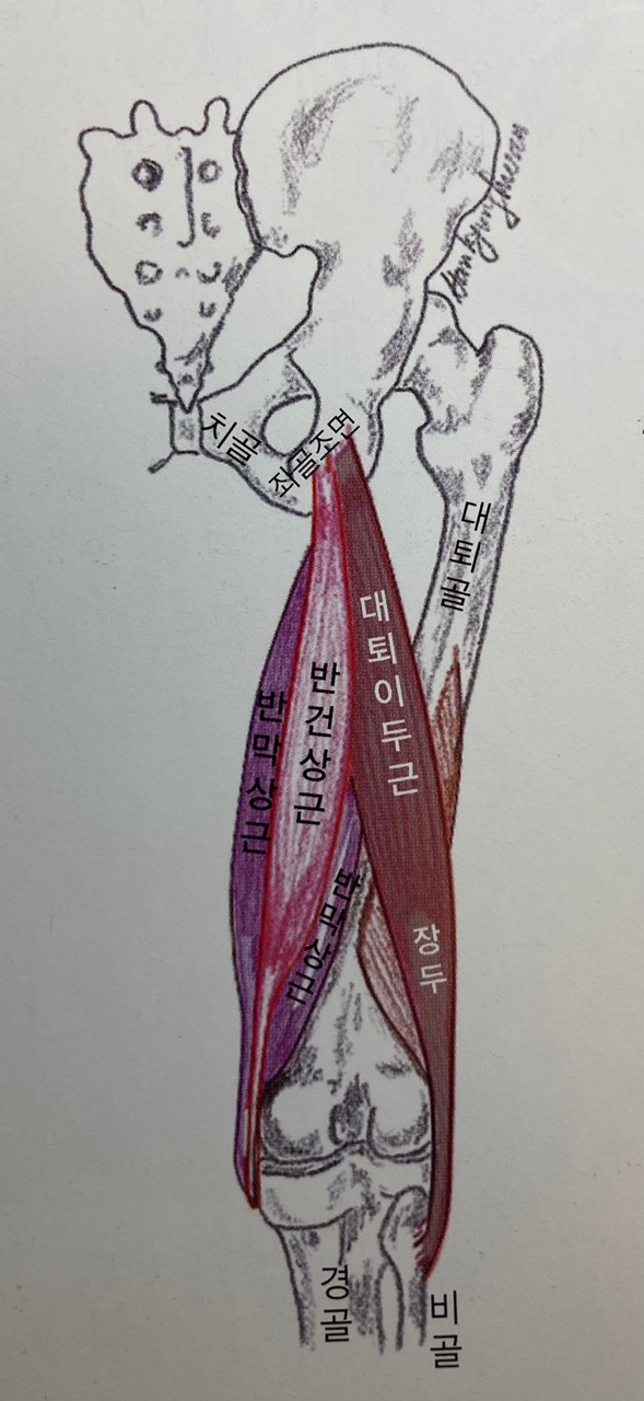 => 대퇴와 종아리를 고정시킨 상태에서는 고관절에서 체간의 신전에 도움을 준다. 햄스트링이 마비된 사람은 대둔근이 똑바로 서는데 필요한 근육긴장(Tone)을 유지할 수 없어 앞으로 쓰러지게 된다.