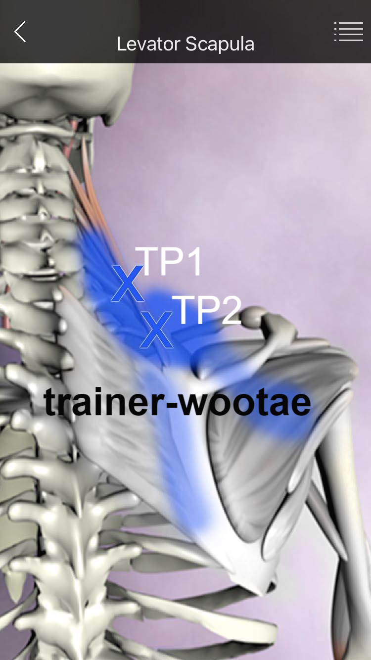 1. TP1 : 상부 승모근의 심부에서 견갑거근이 빠져나오는 부위에 위치한다. 상부 승모근이 이완되는 자세를 찾고, 목은 통증 부위의 반대 측으로 돌려 견갑거근을 긴장시킨 다음, 상부 승모근을 뒤로 밀면서 이완시킬 수 있다.