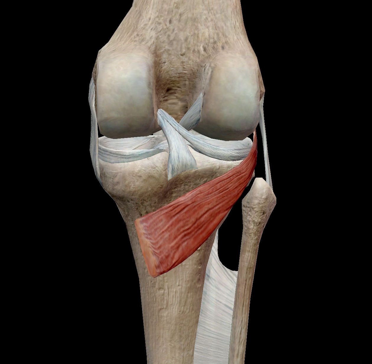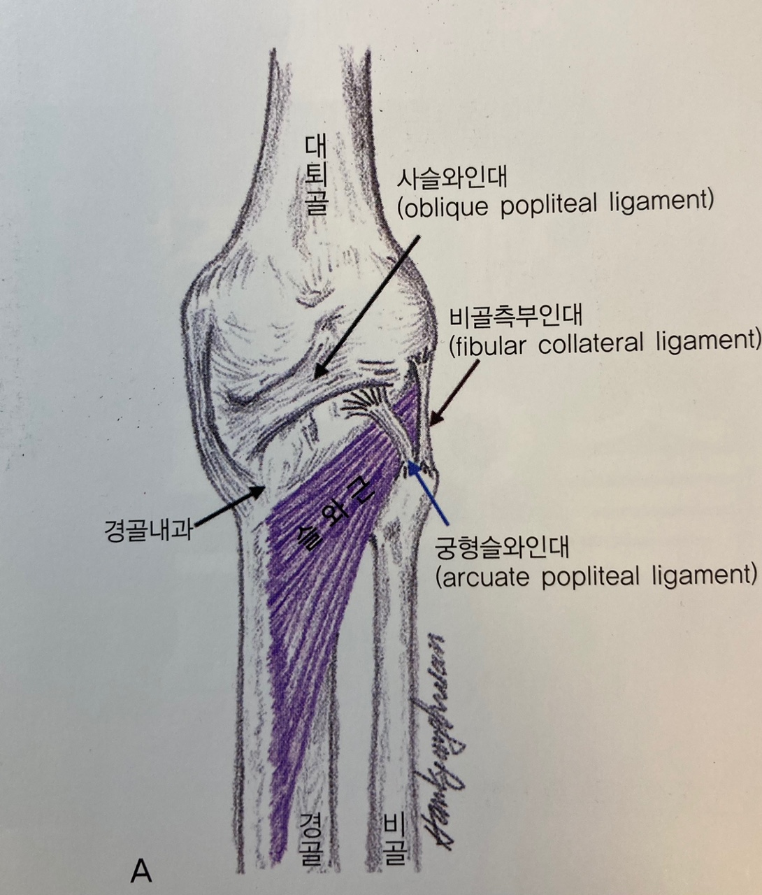 C. 무릎을 조금 구부려서 서있을 때는 후방십자인대(PCL)를 돕기 위해 슬와근이 수축한다. 이때 경사진 경골 관절면에서 대퇴골이 앞으로 빠지는 것을 막아준다. (대퇴골의 지나친 병진운동을 막는다.)