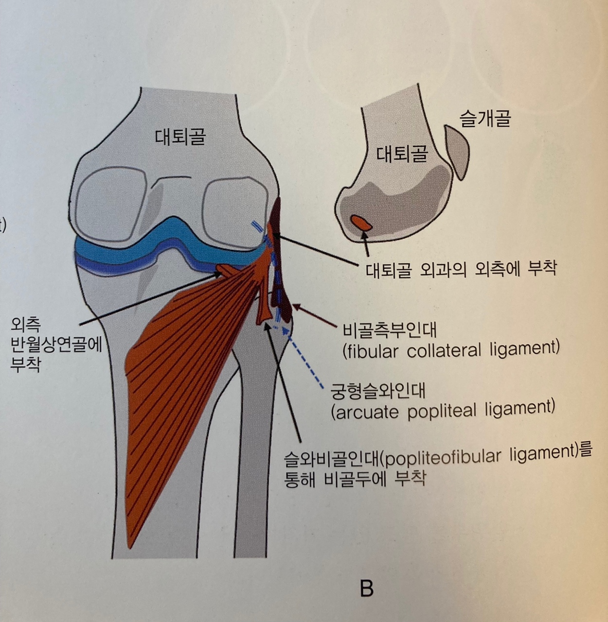 B. 무릎을 최대로 펴서 하퇴가 고정된 상태로 서있으면, 슬와근이 대퇴골을 (경골관절면에서) 약 5도정도 외회전시켜 무릎의 고정된 상태를 풀어 굴곡이 가능하게 한다. (굴곡시 첫 작용)