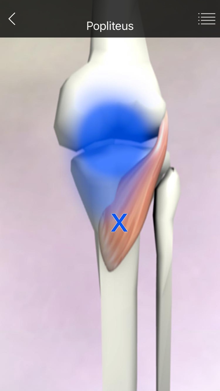 B. 무릎을 최대로 펴서 하퇴가 고정된 상태로 서있으면, 슬와근이 대퇴골을 (경골관절면에서) 약 5도정도 외회전시켜 무릎의 고정된 상태를 풀어 굴곡이 가능하게 한다. (굴곡시 첫 작용)