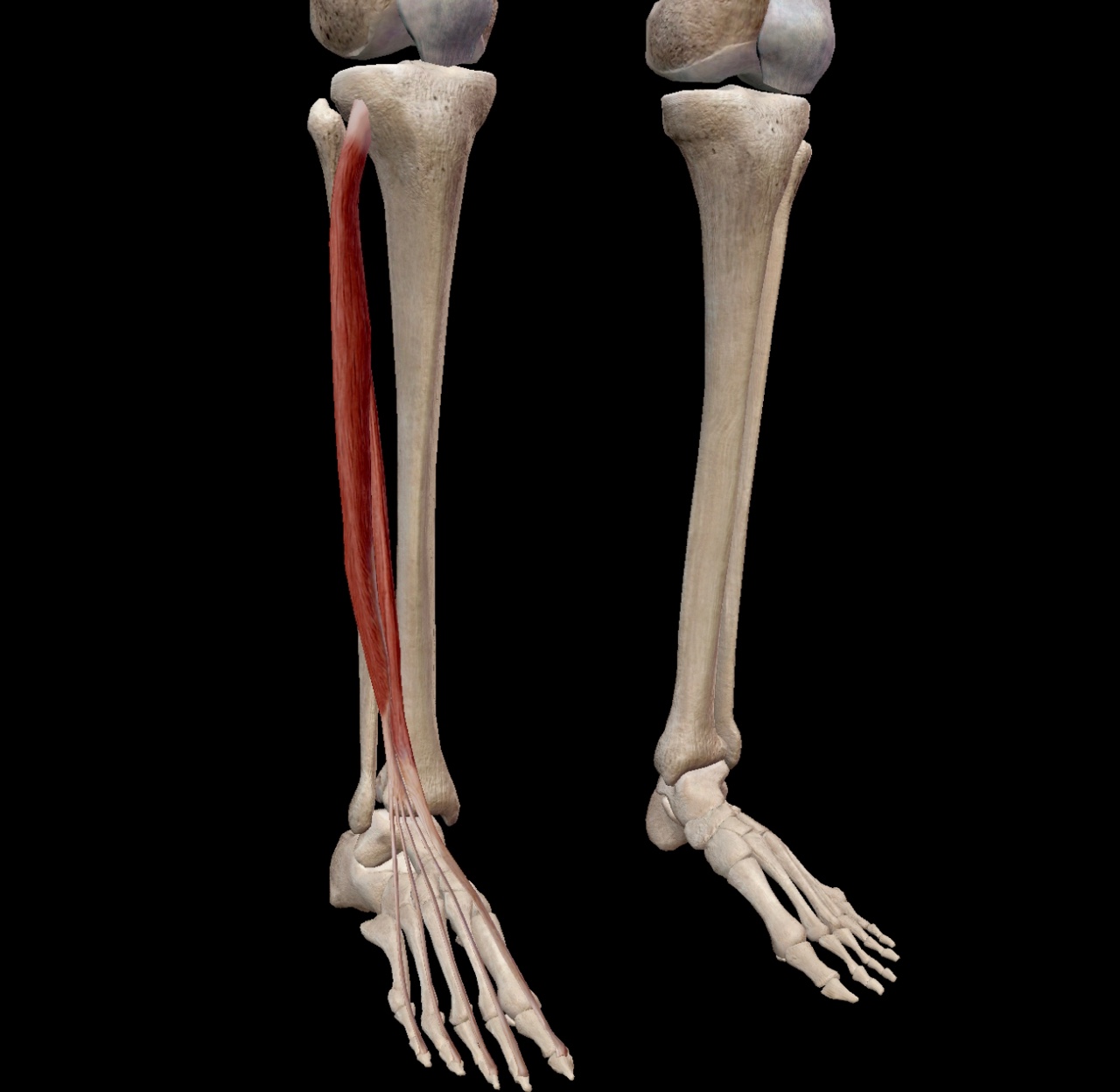 | [기시부] - 경골의 외과(Tibial lateral condyle) - 비골의 근위부 3/4의 전면 - 골간막의 근위부(Proximal part of interosseous membrane) - 하퇴의 전구획에 있는 인접 근육과 구분짓는 근간막 [정지부] - 제2,3,4,5 족지의 중절골과 말절골 [작용] - 발의 배측굴곡(Dorsi flexion) - 발가락의 신전(Extension) - 발의 외번(Eversion) [신경지배] - 심비골신경(Deep peroneal nerve) |