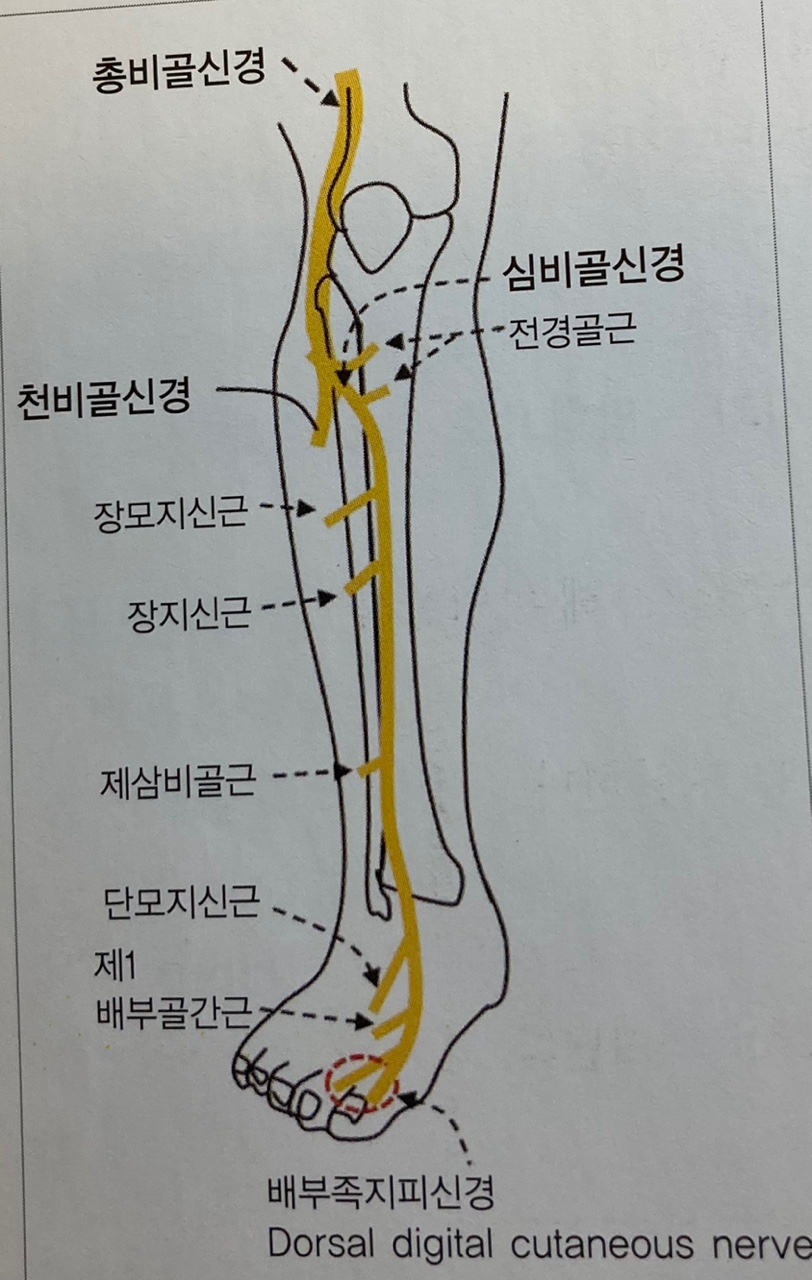 ※ 장지신근과 장모지신근에 단축성긴장이 생기게 되면 발의 등쪽으로 통증이 나타난다.