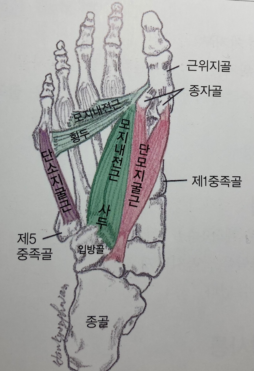 ★ 모지내전근(Adductor hallucis) [기시점] - 사두(Oblique) : 제2,3,4 중족골의 기저부 - 횡두(Transverse) : 제3,4,5 지의 족저중 족골지골간인대 [정지점] - 모지의 근위지골의 기저부 외측면 [작용] - 모지를 내전 - 모지의 근위지골을 굴곡 - 횡단면안정성을 유지 [신경지배] - 외측족저신경(Lateral plantar nerve) ※ 입각기의 앞발딛기 때 가장 활동적으로 수축하여, 엄지발가락을 외측4개의 발가락에 붙여줌으로써 횡족궁을 안정시키고, 중족골두로 분산된 체중에 저항하여 앞발을 지지하는데 중요한 역할을 한다. |