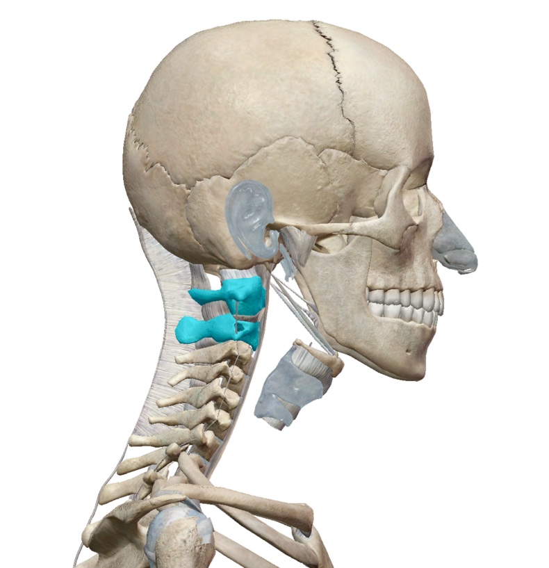 경추 1번의 Atlas는 두개골(Occipital)을 떠받치고 있는 구조다. 이 부분을 연결하고 있는 후두하근육으로는 상두사근(Oblique capitis supeior)과 소후두직근(Rectus capitis posterior minor)이 있다. 여기서 두부(Occipital)의 흔들림과 기울어짐을 컨트롤한다. 경추 2번의 Axis는 생긴 거 자체가 축처럼 생겼다. 그러므로 뼈 형상적으로 회전(Rotation)을 잘하기 위한 구조로 되어 있다는 것을 알 수 있다.