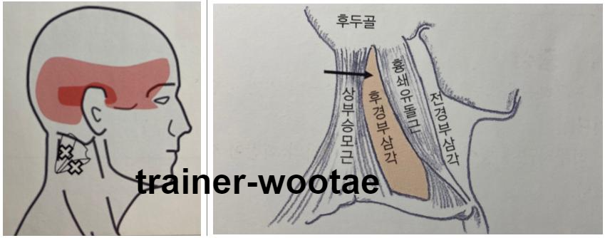 - 후두하근TP의 통증은 후경근에 의한 통증보다 좀 더 상외측면(두개골 하부)의 더 깊은 통증이다.