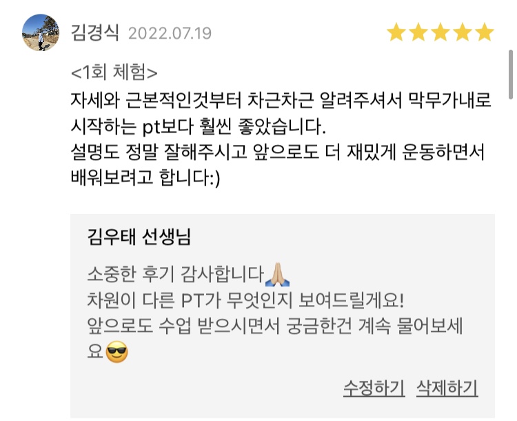 PT등록에 고민중이시라면 PT후기 쭉 보시고 이런 느낌의 수업이구나 느끼시면 됩니다^^